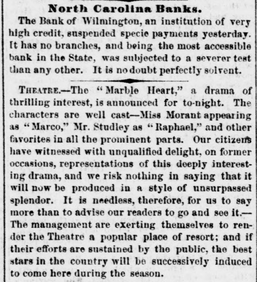 North Carolina Banks. The Bank of Wilmington, an institution of very high credit, suspended specie payments yesterday. It has no branches, and being the most accessible bank in the State, was subjected to a severer test than any other. It is no doubt perfectly solvent. THEATRE.-The "Marble Heart," a drama of thrilling interest, is announced for to-night. The characters are well cast-Miss Morant appearing as "Marco," Mr. Studley as "Raphael," and other favorites in all the prominent parts. Our citizens have witnessed with unqualified delight, on former occasions, representations of this deeply interesting drama, and we risk nothing in saying that it will now be produced in a style of unsurpassed splendor. It is needless, therefore, for us to say more than to advise our readers to go and see it.The management are exerting themselves to render the Theatre a popular place of resort; and if their efforts are sustained by the public, the best stars in the country will be successively induced to come here during the season.