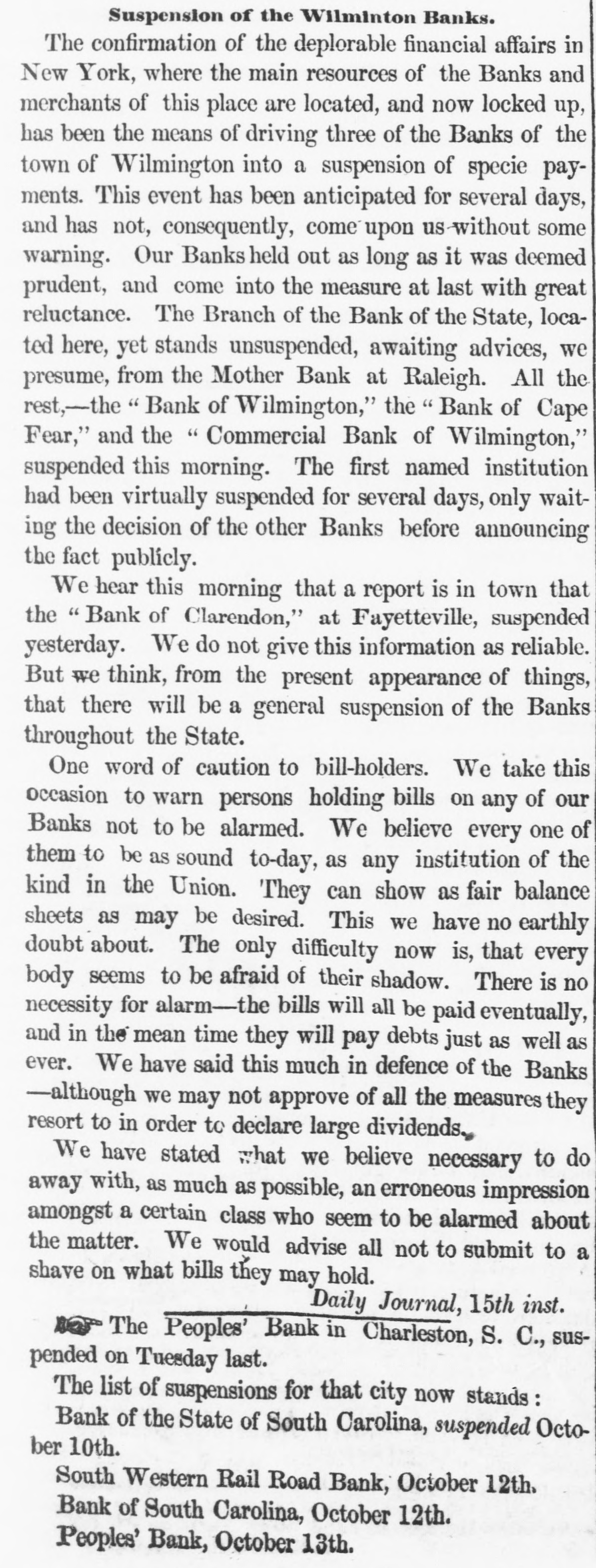 Suspension of the Wilminton Banks. The confirmation of the deplorable financial affairs in New York, where the main resources of the Banks and merchants of this place are located, and now locked up, has been the means of driving three of the Banks of the town of Wilmington into a suspension of specie payments. This event has been anticipated for several days, and has not, consequently, come upon us-without some warning. Our Banks held out as long as it was deemed prudent, and come into the measure at last with great reluctance. The Branch of the Bank of the State, located here, yet stands unsuspended, awaiting advices, we presume, from the Mother Bank at Raleigh. All the rest,-the Bank of Wilmington," the " Bank of Cape Fear," and the " Commercial Bank of Wilmington," suspended this morning. The first named institution had been virtually suspended for several days, only waiting the decision of the other Banks before announcing the fact publicly. We hear this morning that a report is in town that the " Bank of Clarendon," at Fayetteville, suspended yesterday. We do not give this information as reliable. But we think, from the present appearance of things, that there will be a general suspension of the Banks throughout the State. One word of caution to bill-holders. We take this occasion to warn persons holding bills on any of our Banks not to be alarmed. We believe every one of them to be as sound to-day, as any institution of the kind in the Union. They can show as fair balance sheets as may be desired. This we have no earthly doubt about. The only difficulty now is, that every body seems to be afraid of their shadow. There is no necessity for alarm-the bills will all be paid eventually, and in the mean time they will pay debts just as well as ever. We have said this much in defence of the Banks -although we may not approve of all the measures they resort to in order to declare large dividends. We have stated what we believe necessary to do away with, as much as possible, an erroneous impression amongst a certain class who seem to be alarmed about the matter. We would advise all not to submit to a shave on what bills they may hold. Daily Journal, 15th inst. The Peoples' Bank in Charleston, S. C., suspended on Tuesday last. The list of suspensions for that city now stands Bank of the State of South Carolina, suspended October 10th. South Western Rail Road Bank, October 12th. Bank of South Carolina, October 12th. Peoples' Bank, October 13th.