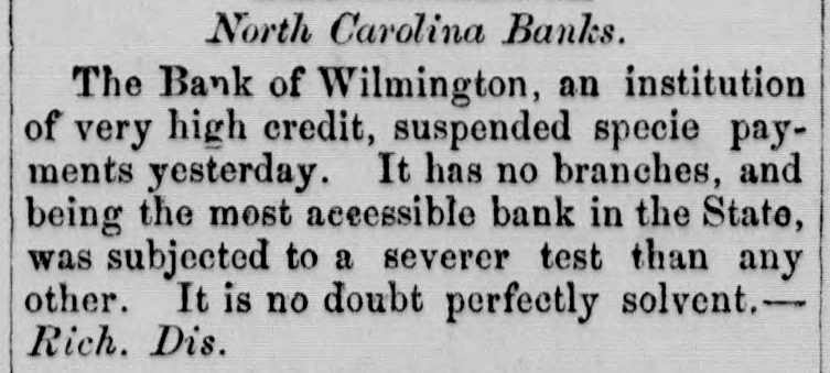 North Carolina Banks. The Bank of Wilmington, an institution of very high credit, suspended specie payments yesterday. It has no branches, and being the most accessible bank in the State, was subjected to a severer test than any other. It is no doubt perfectly solvent.Rich. Dis.