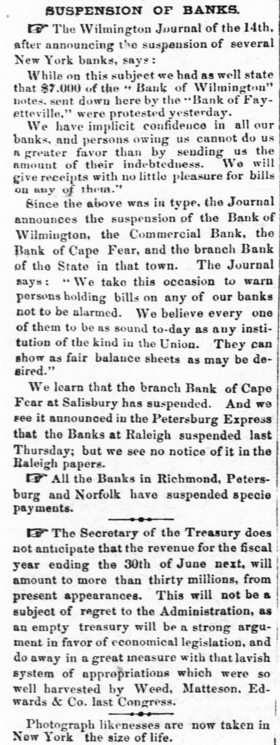 SUSPENSION OF BANKS. The Wilmington Journal of the 14th, after announcing the suspension of several New York banks, says: While on this subject we had as well state that $7.000 of the " Bank of Wilmington" notes. sent down here by the Bank of Fayetteville," were protested yesterday. We have implicit confidence in all our banks, and persons owing us cannot do us a greater favor than by sending us the amount of their indebteduess. We will give receipts with no little pleasure for bills on any of them." Since the above was in type, the Journal announces the suspension of the Bank of Wilmington, the Commercial Bank, the Bank of Cape Fear, and the branch Bank of the State in that town. The Journal says: We take this occasion to warn persons holding bills on any of our banks not to be alarmed. We believe every one of them to be as sound to-day as any institution of the kind in the Union. They can show as fair balance sheets as may be desired." We learn that the branch Bank of Cape Fear at Salisbury has suspended. And we see it announced in the Petersburg Express that the Banks at Raleigh suspended last Thursday; but we see no notice of it in the Raleigh papers. All the Banks in Richmond, Petersburg and Norfolk have suspended specie payments. The Secretary of the Treasury does not anticipate that the revenue for the fiscal year ending the 30th of June next, will amount to more than thirty millions, from present appearances. This will not be a subject of regret to the Administration, as an empty treasury will be a strong argument in favor of economical legislation, and do away in a great ineasure with that lavish system of appropriations which were so well harvested by Weed, Matteson. Edwards & Co. last Congress. Photograph likenesses are now taken in New York the size of life.