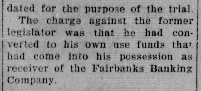The charge against the former legislator was that he had converted to his own use funds that had come into his possession as receiver of the Fairbanks Banking Company.