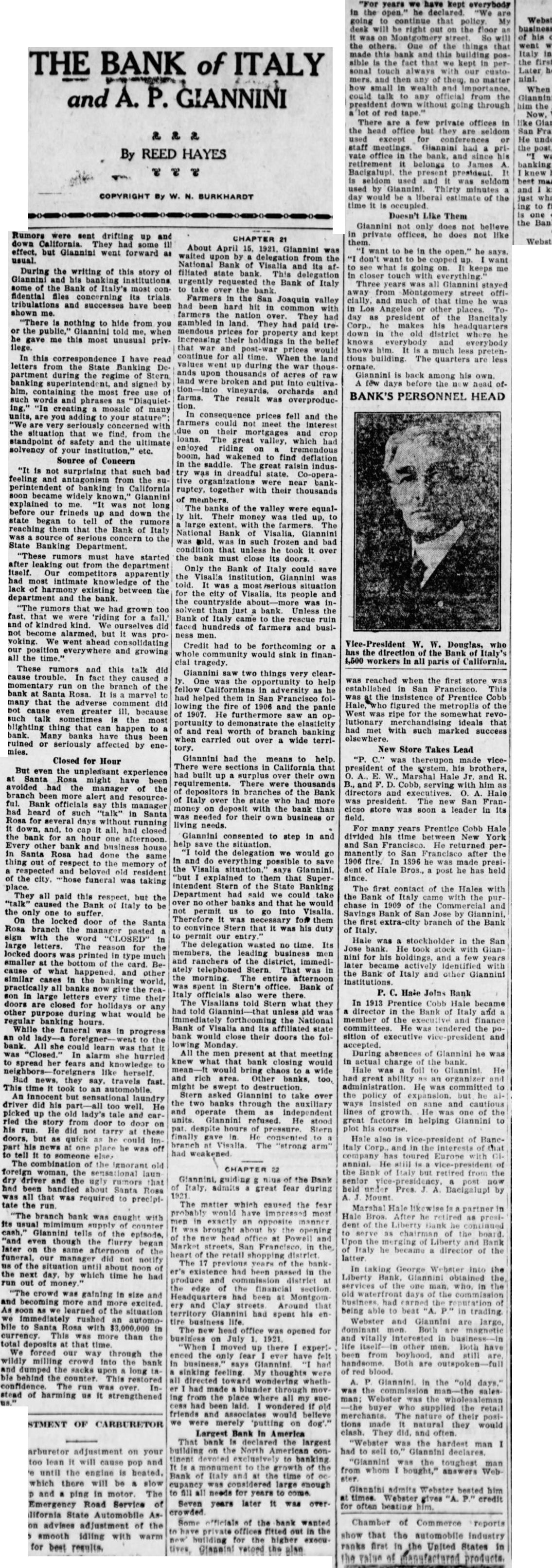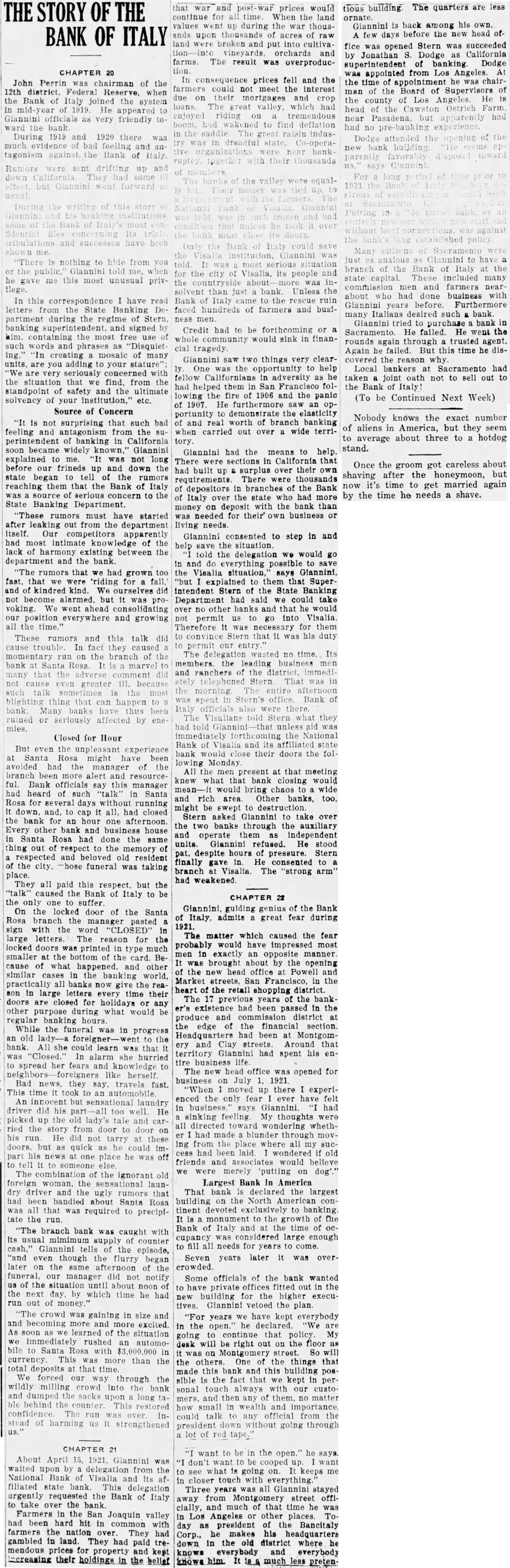 THE BANK of ITALY and P. GIANNINI Rumors were sent drifting up and CHAPTER 21 down California. They some 111 About April 15, 1921. Giannini was effect, but Giannini went forward as waited upon by delegation from the usual. National Bank of Visalia and its During the writing of this story of filiated state bank This delegation Giannini and his banking institutions urgently requested the Bank of Italy some of the Bank of Italy's most con- to take over the fidential files concerning its trials Farmers in the San Joaquin valley tribulations and successes have been had been hard hit in common with shown me. farmers the nation over. They had "There is nothing to hide from you gambled in land They had paid trethe public," Giannini told when mendous prices for property and kept he gave me this most unusual priv. increasing their holdings in the belief ilege. that war and post-war prices would In this correspondence have read continue for all time. When the land letters from the State Banking De- values went up during the war thouspartment during the regime of Stern, ands upon thousands of acres of raw banking superintendent, and signed by land were broken and put into cultivahim, containing the most free use of orchards such words and phrases Disquiet- farms. tion. The result was overproducing." "In creating mosale of many In consequence prices fell and the units, are adding to your stature": "We are very seriously with farmers could not meet the interest the situation that we find. from the due on their mortgages and crop standpoint of safety and the ultimate loans. The great valley, which had enjoyed riding on solvency of your institution." etc. tremendous boom, had wakened to find deflation Source of Concern in the saddle. The great raisin indus"It is not surprising that such bad try was in dreadful state. Co-operafeeling and antagonism from the su- tive organizations were near bankperintendent of banking in California ruptey, together with their thousands soon became widely Giannini of explained "It was not long The banks of the valley were equalbefore our frineds up and down the ly hit. Their money tied up, state began tell the rumors large extent. with the farmers. The reaching them that the Bank of Italy National Bank of Visalia, Giannini was source of serious to the was sold. was in such frozen and bad State Banking Department. condition that unless he took it over "These rumors must have started the bank must close its doors. after leaking out from the department Only the Bank of Italy could save itself. Our competitors apparently the Visalia Giannini was had most intimate knowledge of the told. was situation lack of harmony existing between the for the city of Visalia, its people and department and the bank. the countryside about-more was in"The rumors that we had grown too solvent than just bank. Unless the fast. that we were 'riding for fall,' Bank of Italy came to the rescue ruin and of kindred kind. We ourselves did faced hundreds of farmers and businot become alarmed, but it was pro- ness men. voking. We went ahead consolidating Credit had to be forthcoming or our position and growing whole community would sink in finanall the time." cial tragedy. These rumors and this talk did Giannini saw two things very clearcause trouble. In fact they caused One was the opportunity to help run on the branch of the fellow Californians in adversity as bank at Santa Rosa. is had helped them in San Francisco folmany that the adverse comment did lowing the fire of 1906 and the panic not cause even greater 111, because of 1907. He furthermore saw an opsuch talk sometimes the most portunity to demonstrate the elasticity blighting thing that can happen to of and real worth of branch banking bank. Many banks have thus been when carried out over wide terriruined or seriously affected by enetory. mies. Closed for Hour Giannini had the means to help. There sections in California that But even the unpleasant experience had built up surplus over their own at Santa Rosa might have been requirements. There were thousands avoided had the manager of the depositors in branches of the Bank branch been more alert and resourceof Italy over the state who had more ful. Bank officials say this manager money on deposit with the bank than had heard of such "talk" in Santa was needed for their own business or Rosa for several days without running living needs. down, and, to cap It all, had closed Giannini consented to step in and the bank for an hour one afternoon. help save the situation. Every other bank and house told the delegation we would go Santa Rosa had done the same thing out of the memory of in and do everything possible to save the Visalia situation.' says Giannini. respected and beloved old resident "but explained to them that Superthe city, "hose funeral was taking place. intendent Stern of the State Banking They all paid this respect. but the Department had said we could take over no other banks and that he would "talk" caused the Bank of Italy to be the only one to suffer. not permit us go into Visalia. Therefore necessary for them On the locked door of the Santa Rosa branch the manager pasted to convince Stern that it was his duty to permit our sign with the word "CLOSED" in The wasted no time. Its large letters. The reason for the locked doors was printed in type much members, the leading men and ranchers of the district, immedismaller at the bottom the card. Beately telephoned Stern. That was in cause of what and other the morning. The entire afternoon similar in the banking world, was spent Stern's office. Bank of practically all banks now give the reaItaly officials also were there. son in large letters every time their The Visalians told Stern what they doors are closed for holidays or any had told unless aid was other purpose during what would be regular banking immediately forthcoming the National hours. Bank of Visalia and its affiliated state While the funeral was in progress bank would close th