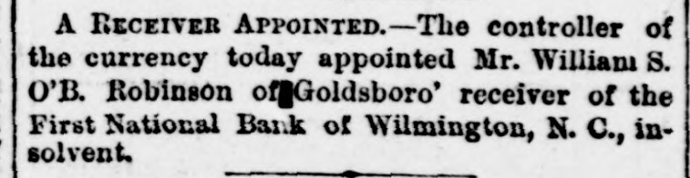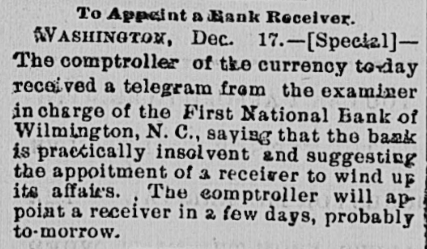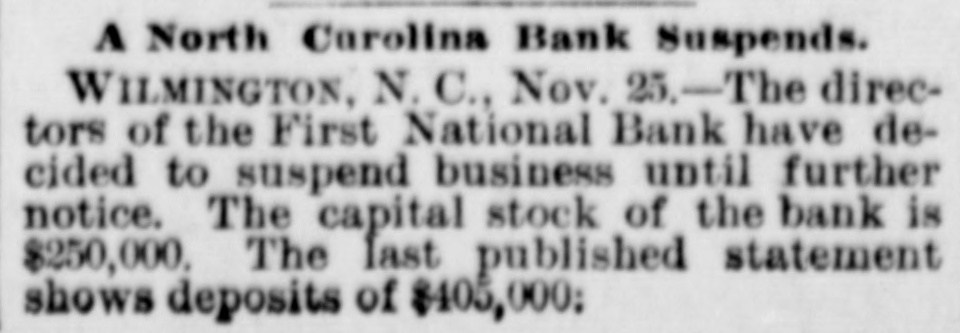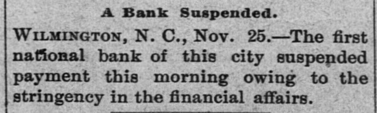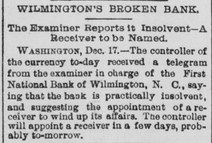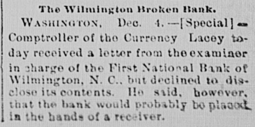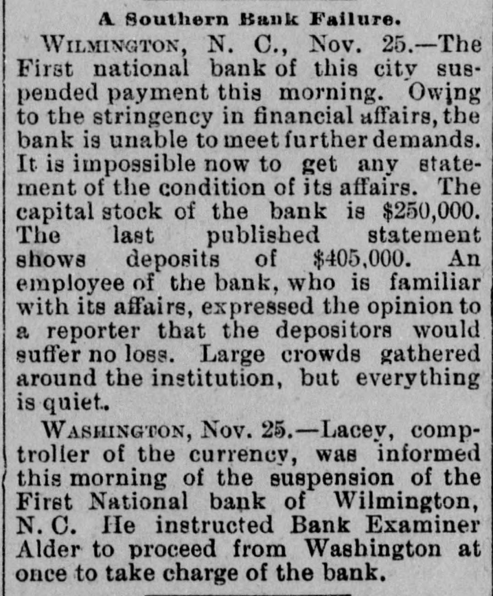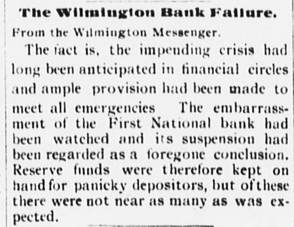 The Wilmington Bank Failure. From the Wilmington Messenger. The fact is, the impending crisis had long been anticipated in financial circles and ample provision had been made to meet all emergencies The embarrassment of the First National bank had been watched and its suspension had been regarded as a foregone conclusion. Reserve funds were therefore kept on hand for panicky depositors, but of these there were not near as many as was expected.