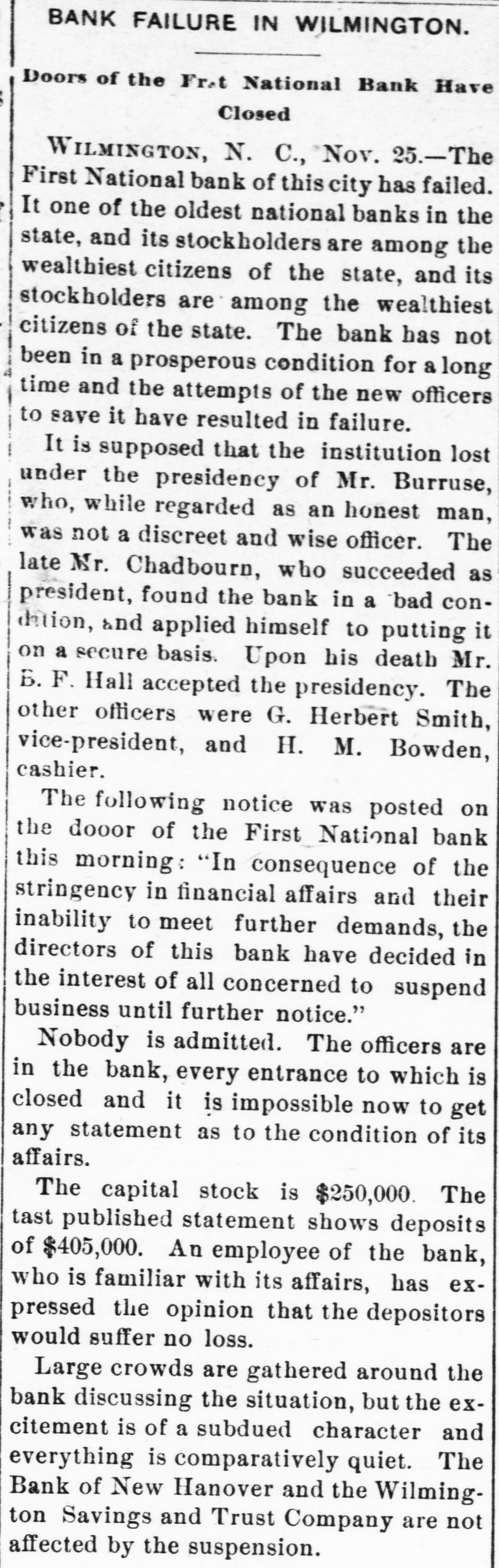 BANK FAILURE IN WILMINGTON. Doors of the Fr.t National Bank Have Closed WILMINGTON, N. C., Nov. 25.-The First National bank of this city has failed. It one of the oldest national banks in the state, and its stockholders are among the wealthiest citizens of the state, and its stockholders are among the wealthiest citizens of the state. The bank has not been in a prosperous condition for a long time and the attempts of the new officers to save it have resulted in failure. It is supposed that the institution lost under the presidency of Mr. Burruse, who, while regarded as an honest man, was not a discreet and wise officer. The late Mr. Chadbourn, who succeeded as president, found the bank in a bad condilion, and applied himself to putting it on a secure basis. Upon his death Mr. B. F. Hall accepted the presidency. The other officers were G. Herbert Smith, vice-president, and H. M. Bowden, cashier. The following notice was posted on the dooor of the First National bank this morning : "In consequence of the stringency in financial affairs and their inability to meet further demands, the directors of this bank have decided in the interest of all concerned to suspend business until further notice." Nobody is admitted. The officers are in the bank, every entrance to which is closed and it is impossible now to get any statement as to the condition of its affairs. The capital stock is $250,000. The tast published statement shows deposits of $405,000. An employee of the bank, who is familiar with its affairs, has expressed the opinion that the depositors would suffer no loss. Large crowds are gathered around the bank discussing the situation, but the excitement is of a subdued character and everything is comparatively quiet. The Bank of New Hanover and the Wilmington Savings and Trust Company are not affected by the suspension.