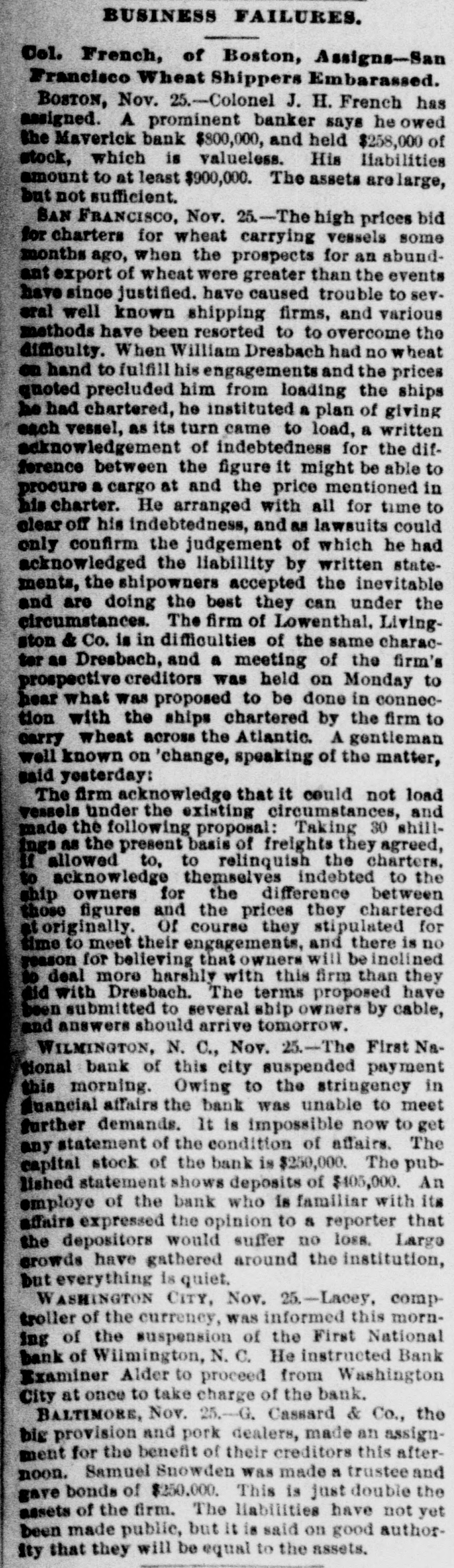 BUSINESS FAILURES. Col. French, of Boston, Assigns-San Francisco Wheat Shippers Embarassed. BOSTON, Nov. 25.-Colonel J. H. French has assigned. A prominent banker says he owed the Maverick bank $800,000, and held $258,000 of stock, which is valueless. His liabilities amount to at least $900,000. The assets arelarge, but not sufficient. SAN FRANCISCO, Nov. 25.-The high prices bid for charters for wheat carrying vessels some months ago, when the prospects for an abundant export of wheat were greater than the events have since justified. have caused trouble to sevoral well known shipping firms, and various methods have been resorted to to overcome the difficulty. When William Dresbach had no wheat on hand to fulfill his engagements and the prices quoted precluded him from loading the ships he had chartered, he instituted a plan of giving each vessel, as its turn came to load, a written acknowledgement of indebtedness for the difference between the figure it might be able to procure a cargo at and the price mentioned in his charter. He arranged with all for time to clear off his indebtedness, and as lawsuits could only confirm the judgement of which he had acknowledged the liabillity by written statements, the shipowners accepted the inevitable and are doing the best they can under the circumstances. The firm of Lowenthal, Livingston & Co. is in difficulties of the same character as Dresbach, and a meeting of the firm's prospective creditors was held on Monday to hear what was proposed to be done in connection with the ships chartered by the firm to carry wheat across the Atlantic. A gentleman well known on 'change, speaking of the matter, said yesterday: The firm acknowledge that it could not load Vessels under the existing circumstances, and made the following proposal: Taking 30 shillings as the present basis of freights they agreed, If allowed to, to relinquish the charters. to acknowledge themselves indebted to the ship owners for the difference between those figures and the prices they chartered at originally. or course they stipulated for time to meet their engagements, and there is no reason for believing that owners will be inclined to deal more harshly with this firm than they did with Dresbach. The terms proposed have been submitted to several ship owners by cable, and answers should arrive tomorrow. WILMINGTON, N. C., Nov. 25.-The First National bank of this city suspended payment this morning. Owing to the stringency in fuancial affairs the bank was unable to meet further demands. It is impossible now to get any statement of the condition of affairs. The capital stock of the bank is $250,000. The published statement shows deposits of $405,000. An employe of the bank who is familiar with its affairs expressed the opinion to a reporter that the depositors would suffer no loss. Largo crowds have gathered around the institution, but everything is quiet, WASHINGTON CITY, Nov. 25.-Lacey, comptroller of the currency, was informed this morning of the suspension of the First National bank of Wilmington, N. C. He instructed Bank Examiner Alder to proceed from Washington City at once to take charge of the bank. BALTIMORE, Nov. 25.-G. Cassard & Co., the big provision and pork dealers, made an assignment for the benefit of their creditors this afternoon. Samuel Snowden was made a trustee and gave bonds of $250,000. This is just double the assets of the firm. The liabilities have not yet been made public, but It is said on good authorQty that they will be equal to the assets.