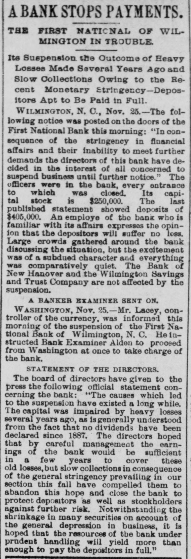 A BANK STOPS PAYMENTS. THE FIRST NATIONAL OF WILMINGTON IN TROUBLE. Its Suspension the Outcome of Heavy Losses Made Several Years Ago and Slow Collections Owing to the Recent Monetary Stringency-Depositors Apt to Be Paid in Full. WILMINGTON, N. C., Nov. 25.-The following notice was posted on the doors of the First National Bank this morning: "In consequence of the stringency in financial affairs and their inability to meet further demands the directors of this bank have decided in the interest of all concerned to suspend business until further notice." The officers were in the bank, every entrance to which was closed. Its capital stock is $250,000. The last published statement showed deposits of $405,000. An employe of the bank who is familiar with its affairs expresses the opinion that the depositors will suffer no loss. Large crowds gathered around the bank disoussing the situation, but the excitement was of a subdued character and everything was comparatively quiet. The Bank of New Hanover and the Wilmington Savings and Trust Company are not affected by the suspension. A BANKER EXAMINER SENT ON. WASHINGTON, Nov. 25.-Mr. Lacey, controller of the currency. was informed this morning of the suspension of the First National Bank of Wilmington, N. C. He instructed Bank Examiner Alden to proceed from Washington at once to take charge of the bank. STATEMENT OF THE DIRECTORS. The board of directors have given to the press the following official statement concerning the bank: "The causes which led to the suspension have existed a long while. The capital was impaired by heavy losses several years ago, as is generally understood from the fact that no dividends have been declared since 1887. The directors hoped that by careful management the earnings of the bank would be sufficient in a few years to cover these old losses, but slow collections in consequence of the general stringency prevailing in our section this fall have compelled them to abandon this hope and close the bank to protect depositors as well as stockholders against further risk. Notwithstanding the shrinkage in many securities on account of the general depression in business, it is hoped that the resources of the bank under prudent handling will yield more than enough to pay the depositors in full."