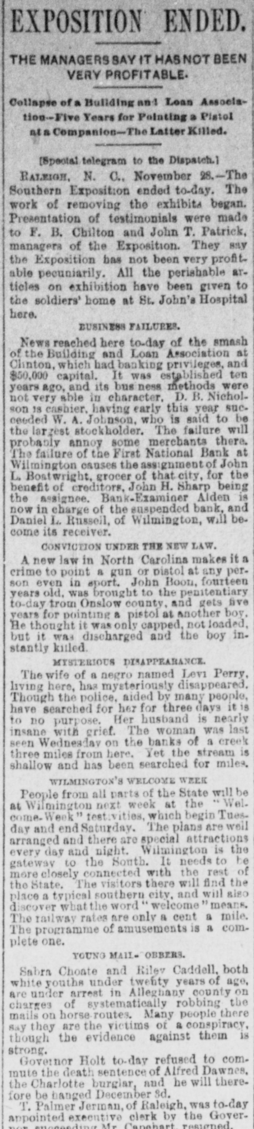 EXPOSITION ENDED. THE MANAGERS SAY IT HASNOT BEEN VERY PROFITABLE. Collapse of a Building and Loan Association-Five Years for Pointing a Pistol at a Companion-The Latter Killed. [Spectal telegram to the Dispatch.] RALEIGH, N. C., November 28.-The Southern Exposition ended to-day. The work of removing the exhibits began. Presentation of testimonials were made to F. B. Chilton and John T. Patrick, managers of the Exposition. They say the Exposition has not been very profitable pecuniarily. All the perishable articles on exhibition have been given to the soldiers' home at St. John's Hospital here. BUSINESS FAILURES. News reached here to-day of the smash of the Building and Loan Association at Chnton, which had banking privileges, and $50,000 capital. It was established ten years ago, and its bus ness methods were not very able in character. D. B. Nicholson 18 cashier. having early this year succeeded W. A. Johnson, who is said to be the largest stockholder. The failure will probably annoy some merchants there. The failure of the First National Bank at Wilmington causes the assignment of John L. Boatwright, grocer of that city, for the benefit of creditors, John H. Sharp being the assignee. Bank-Examiaer Alden is now in charge of the suspended bank, and Daniel L. Russell, of Wilmington, will become its receiver. CONVICTION UNDER THE NEW LAW. A new law in North Carolina makes it a crime to point a gun or pistol at any person even in sport. John Boon, fourteen years old, was brought to the penitentiary to-day trom Onslow county, and gets five years for pointing a pistol at another boy, He thought it was only capped, not loaded, but it was discharged and the boy instantly killed. MYSTERIOUS DISAPPEARANCE. The wife of a negro named Levi Perry, living here, has mysteriously disappeared. Though the police, aided by many people, have searched for her for three days it is to no purpose. Her husband is nearly insane with grief. The woman was last seen Wednesday on the banks of a creek three miles from here. Yet the stream is shallow and has been searched for miles. WILMINGTON'S WELCOME WEEK People from all parts of the State will be at Wilmington next week at the Welcome- Week" festivities, which begin Tuesday and end Saturday. The plans are well arranged and there are special attractions every day and night. Wilmington is the gateway to the South. It needs to be more closely connected with the rest of the State. The visitors there will find the place a typical southern city, and will also discover what the word welcome means. The railway rates are only & cent a mile. The programme of amusements is a complete one. YOUNG MAIL- OBBERS. Sabra Choate and Rilev Caddell, both white youths under twenty years of age, are under arrest in Allegbany county on charges of systematically robbing the mails on horse routes. Many people there say they are the victims of a conspiracy, though the evidence against them is strong. Governor Holt to-day refused to commute the death sentence of Alfred Dawnes. the Charlotte burgiar, and he will therefore be hanged December 3d. T. Palmer Jerman, of Raleigh, was to-day appointed executive clerk by the GoverMr. Capehart resigned.