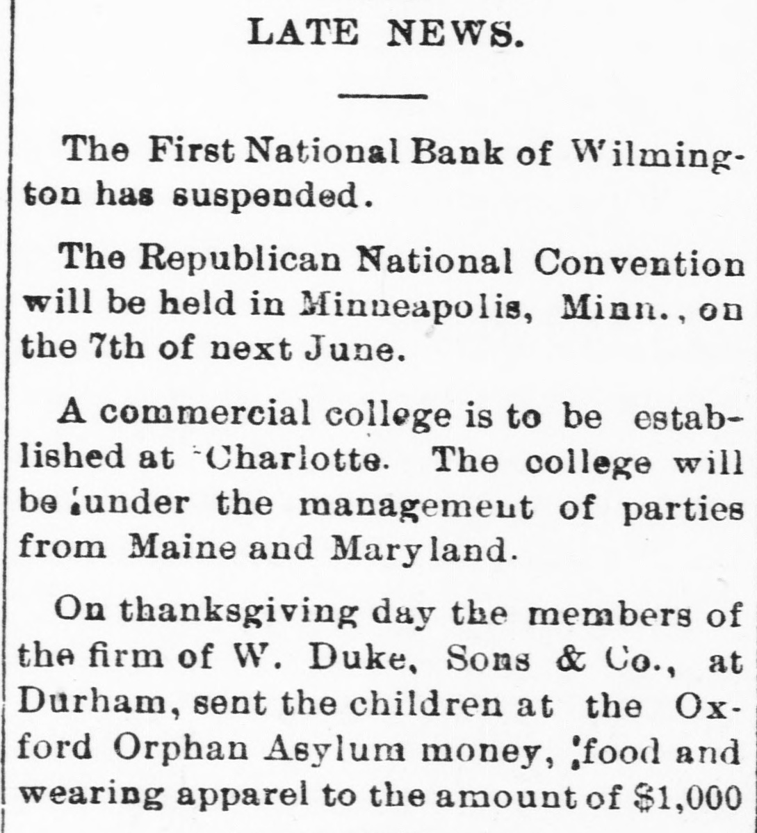 LATE NEWS. The First National Bank of Wilmington has suspended. The Republican National Convention will be held in Minneapolis, Minn., on the 7th of next June. A commercial college is to be established at Charlotte. The college will be Junder the management of parties from Maine and Maryland. On thanksgiving day the members of the firm of W. Duke, Sons & Co., at Durham, sent the children at the Oxford Orphan Asylum money, 'food and wearing apparel to the amount of $1,000