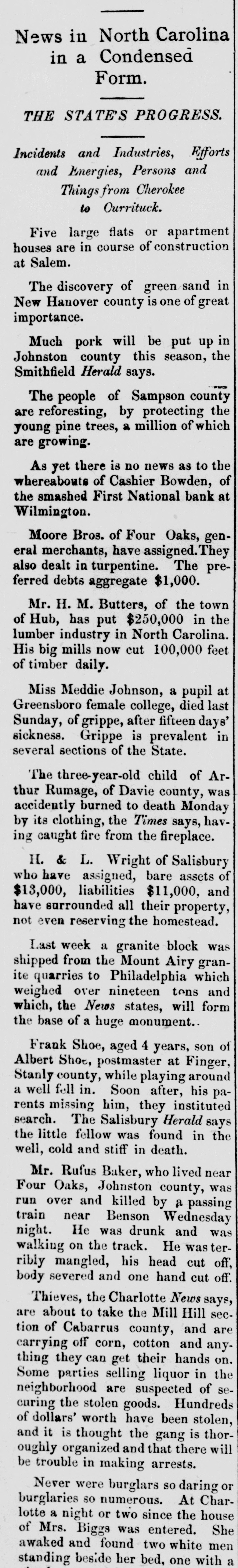 News in North Carolina in a Condensed Form. THE STATE'S PROGRESS. Incidents and Industries, Efforts and Energies, Persons and Things from Cherokee to Ourrituck. Five large flats or apartment houses are in course of construction at Salem. The discovery of green sand in New Hanover county is one of great importance. Much pork will be put up in Johnston county this season, the Smithfield Herald says. The people of Sampson county are reforesting, by protecting the young pine trees, 2 million of which are growing. As yet there is no news as to the whereabouts of Cashier Bowden, of the smashed First National bank at Wilmington. Moore Bros. of Four Oaks, general merchants, have assigned. They also dealt in turpentine. The preferred debts aggregate $1,000. Mr.H.M. Butters, of the town of Hub, has put $250,000 in the lumber industry in North Carolina. His big mills now cut 100,000 feet of timber daily. Miss Meddie Johnson, a pupil at Greensboro female college, died last Sunday, of grippe, after fifteen days' sickness. Grippe is prevalent in several sections of the State. The three-year-old child of Arthur Rumage, of Davie county, was accidently burned to death Monday by its clothing, the Times says, having caught fire from the fireplace. H. & L. Wright of Salisbury who have assigned, bare assets of $13,000, liabilities $11,000, and have surrounded all their property, not even reserving the homestead. Last week a granite block was shipped from the Mount Airy ite to quarries Philadelphia which granover tons and form which, weighed the News nineteen states, will the base of a huge monument.. Frank Shoe, aged 4 years, son of Albert Shoe, postmaster at Finger, Stanly county, while playing around a well fell in. Soon after, his parents missing him, they instituted search. The Salisbury Herald says the little fellow was found in the well, cold and stiff in death. Mr. Rufus Baker, who lived near Four Oaks, Johnston county, was run over and killed by a passing train near Benson Wednesday night. He was drunk and was walking on the track. He waste ribly mangled, his head cut off, body severed and one hand cut off. Thieves, the Charlotte News says, are about to take the Mill Hill section of Cabarrus county, and are carrying off corn, cotton and anything they can get their hands on. Some parties selling liquor in the neighborhood are suspected of securing the stolen goods. Hundreds of dollars' worth have been stolen, the is thorand that will and be oughly trouble it is organized thought gang there in making arrests. Never were burglars so daring or burglaries so numerous. At Charlotte a night or two since the house of Mrs. Biggs was entered. found two awaked and white men She standing beside her bed, one with a