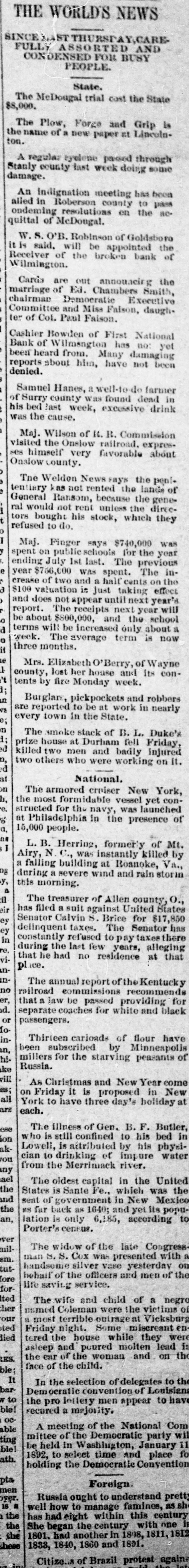 THE WORLD'S NEWS ST SINCE FULLY CONDENSED FOR BUSY AND PEOPLE. State, $8,000. The McDongal trial cost the State The Plow, ton. the name of a new Force paper and at Lincoln. Grip doing some Stanly damage. A regula: county kyelone last week passed through An ondeming alled in indignation Roberson meeting has been quittal of McDougal. resolutions county on the to pass aoit W. is said, 8. O'B, will Robinson be of Goldsboro Receiver Wilmington. of the broken appointed bank the marriage of Ed. announcing chairman Cards are out Chambers Smith, the of Col. Paul Falson, Committee Cashier ter of Bowden and Demoeratic Miss Faison, Executive daugh. been Bank of Umangton or First National heard from. has no: been denied. reports about him, Many have damaging not yet Samuel of his was Surry bed the last cause. county Hanes, week, was a well-to-do excessive found dead farmer drink in Maj. ses visited the Wilson Onslow of 16. R. Commission Onslow county. himself favorable tailroad. expres. about tentary The Weldon not News Fays the General Hansom, rented the pent. ral tors would not rent because unless the lands of generefused bought to do. his stock, which the directo they Mai. Finger ending spent on public says $740,000 1st last. The the year creake $756,000 of July was spent. for previous was $100 two and report. about does valuation The not appear and is just half taking The on the effect in$800,000, year will year's is term now terms week. will The be average increased and only the about school three months. concounty, Mrs. Elizabeth lost her Berry, of Wayne tents by fire Monday house week. and Its are Burglars, reported pickpockets to and robbers in the work in d; every town prize The smoke stack be at State. nearly ed killed two house at Durham of B. fell L. Duke's ed two others men who Were and working on it. badly Friday, injured National. on The armored the most structed for formidable the erniser vessel New yet con York, 1, 15,000 people. Philadelphia navy, in the was presence of launched as I Airy, L.B. N Herring, C., was former'y of ng rain storin y, during a this falling a severe building wind instantly at Roanoke, and killed Va.. Mt. by morning. a of fl The treasurer has eir ey Senator filed Calvin a suit against Allen United county, States ey delinquent taxes, S. Brice for $17,850 in at that vihe had no years, inconstantly during that place. the refused last few residence to The Paytaxes there Senator' alleging inno railroad The annual report of the er, that a law commissions be Kentucky d. separate passed recommends or passengers. coaches for white providing for and black Io inn, millers been Thirleen subscribed carloads by of flour have hike Russia. for the starving Minneapolis peasants of vill As Christmas all on York Friday to it is and proposed New Year come are each. have three day's holiday in New ese his to ion is who The is illness still confined of Gen. B. F. Butler. ak Lowell, you cian to drinking in actributed by his bed physi- in ny the Merrimack impure ael from The oldest or river. Water the States capital in the and the #8 far of government in New was an, seat lation back is is Sante Fe., as 1640: which yet Mexico United the Porter's centure only 6,185, according popu- to ver milsm man The S. widow S. Cox of the late tutmen behaif handsome silver was Vase presented Congress. ore life of the officers and yesterday on forsaving service. Ited ther our named a most The wife Coleman and were child the of a negro ted Friday night. outrage at Some Vicksburg died the house tered terrible while misereant en- victims of RES ble face asleep the ear or and the child. of the poured woman molten and they lead on were the It In the selection barw to lettery of Louisiana bie oc recured a majority. men appear to have A able ting be mittee held meeting of in the of Democratic the National Com ble! ath. holding 1892, to select Washington, time And January party the Democratic Convention place fo pta Foreign men byer. is well Russia how ought to to understand the century the with one She began the has had eight manage within famines, this as sh pretty the 1811,1812 hese again Citize. of Brazil protest