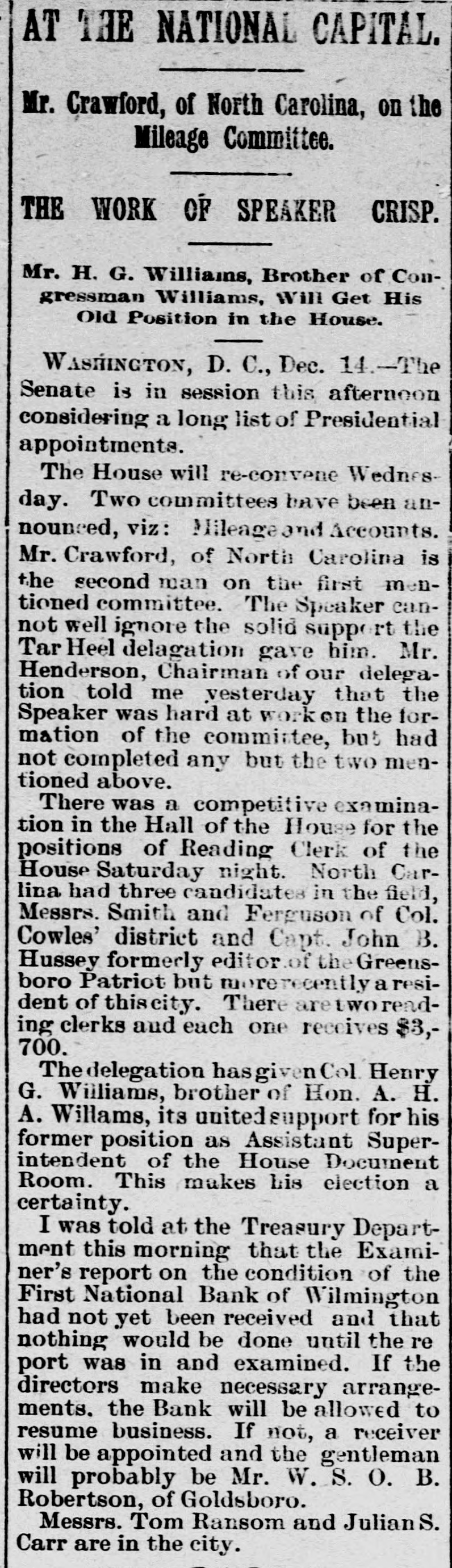 AT THE NATIONAL CAPITAL. Mr. Crawford, of North Carolina, on the Mileage Committee. THE WORK OF SPEAKER CRISP. Mr. H. G. Williams, Brother of Congressman Williams, Will Get His Old Position in the House. WASHINGTON, D. C., Dec. 14.-The Senate is in session this afternoon considering a long list of Presidential appointments. The House will re-convene Wednesday. Two committees have been announced, viz: Mileage and Accounts. Mr. Crawford, of North Carolina is the second man on the first mentioned committee. The Speaker cannot well ignore the solid supp rt the Tar Heel delagation gave him. Mr. Henderson, Chairman of our delegation told me vesterday that the Speaker was hard at work on the formation of the committee, but had not completed any but the two mentioned above. There was a competitive examination in the Hall of the House for the positions of Reading Clerk of the House Saturday night. North Carlina had three candidates in the field, Messrs. Smith and Ferguson of Col. Cowles' district and Capt. John B. Hussey formerly editor of the Greensboro Patriot but more recently a resident of thiscity. There are tworending clerks and each one receives $3,700. The delegation hasgiven Col. Henry G. Williams, brother of Hon. A. H. A. Willams, its united support for his former position as Assistant Superintendent of the House Document Room. This makes his election a certainty. I was told at the Treasury Department this morning that the Examiner's report on the condition of the First National Bank of Wilmington had not yet been received and that nothing would be done until the re port was in and examined. If the directors make necessary arrangements. the Bank will be allowed to resume business. If not, a receiver will be appointed and the gentleman will probably be Mr. W. S. O. B. Robertson, of Goldsboro. Messrs. Tom Ransom and Julian S. Carr are in the city.