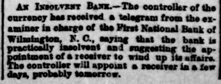 AN INSOLVENT BANK.-The controller of the currency has received a telegram from the examiner in charge of the First National Bank of Wilmington, N. C., saying that the bank is practically insolvent and suggesting the appointment of a receiver to wind up its affairs. The controller will appoint a receiver in a few days, probably tomorrow.