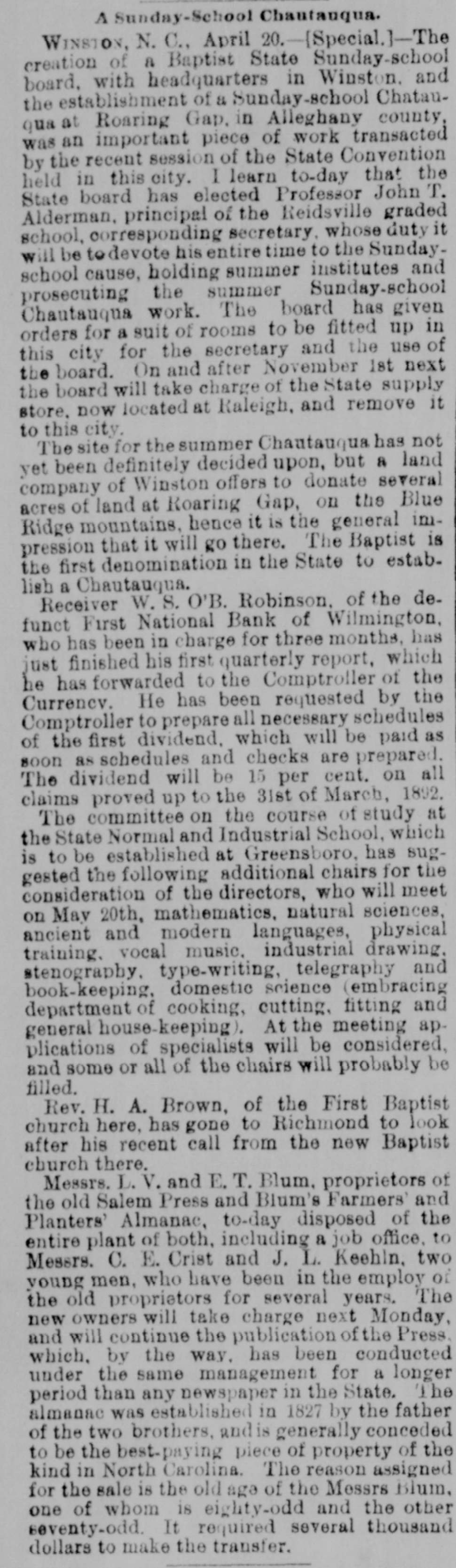 A Sunday-School Chautanqua. WINSTON, N. C., April 20.-{Special.]-The creation of & Baptist State Sunday-school board, with headquarters in Winston. and the establishment of 8 Sunday-school Chatauqua at Roaring Gap. in Alleghany county, was an important piece of work transacted by the recent session of the State Convention held in this city. I learn to-day that the State board has elected Professor John T. Alderman, principal of the Reidsville graded school, corresponding secretary. whose duty it will be edevote his entire time to the Sundayschool cause, holding summer institutes and prosecuting the summer Sunday-school Chautauqua work. The board has given orders for a suit of rooms to be fitted up in this city for the secretary and the use of the board. On and after November 1st next the board will take charge of the State supply store. now located at Raleigh, and remove it to this city. The site for the summer Chautauqua has not yet been definitely decided upon, but a land company of Winston offers to donate several acres of land at Roaring Gap, on the Blue Ridge mountains, hence it is the general impression that it will go there. The Baptist is the first denomination in the State to establish a Chautauqua. Receiver W. S. O'B. Robinson. of the defunct First National Bank of Wilmington, who has been in charge for three months, has just finished his first quarterly report, which he has forwarded to the Comptroller of the Currency. He has been requested by the Comptroller to prepare all necessary schedules of the first dividend, which will be paid as soon as schedules and checks are prepared. The dividend will be 15 per cent. on all claims proved up to the 31st of March, 1892. The committee on the course of study at the State Normal and Industrial School, which is to be established at Greensboro, has suggested the following additional chairs for the consideration of the directors, who will meet on May 20th, mathematics. natural sciences, ancient and modern languages, physical training. vocal music, industrial drawing. stenography. type-writing, telegraphy and book-keeping, domestic science (embracing department of cooking, cutting, fitting and general house-keeping). At the meeting applications of specialists will be considered, and some or all of the chairs will probably be filled. Rev. H. A. Brown, of the First Baptist church here, has gone to Richmond to look after his recent call from the new Baptist church there. Messrs. L. V. and E. T. Blum. proprietors of the old Salem Press and Blum's Farmers' and Planters' Almanac, to-day disposed of the entire plant of both, including a job office. to Messrs. C. E. Crist and J. L. Keehln. two young men, who have been in the employ of the old proprietors for several years. The new owners will take charge next Monday, and will continue the publication of the Press. which. by the way. has been conducted under the same management for a longer period than any newspaper in the State. The almanac was established in 1827 by the father of the two brothers, andis generally conceded to be the best-paying piece of property of the kind in North Carolina. The reason assigned for the sale is the old age of the Messrs Blum, one of whom is eighty-odd and the other seventy-odd. It required several thousand dollars to make the transfer.