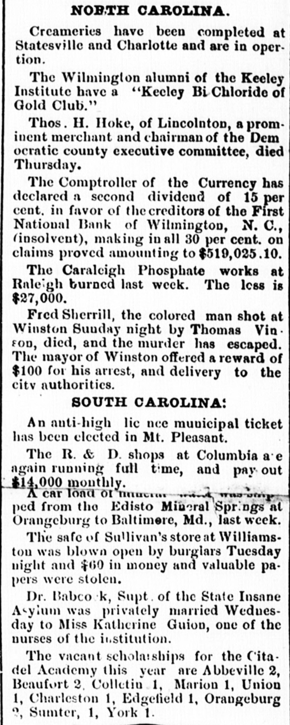 NORTH CAROLINA. Creameries have been completed at Statesville and Charlotte and are in opertion. The Wilmington alumni of the Keeley Institute have a "Kecley Bi Chloride of Gold Club." Thos. H. Hoke, of Lincolnton, a prominent merchant and chairman of the Dem ocratic county executive committee, died Thursday. The Comptroller of the Currency has declared a second dividend of 15 per cent. in favor of the creditors of the First National Bank of Wilmington, N. C., (insolvent), making in all 30 per cent. on claims proved amounting to $519,025.10. The Caraleigh Phosphate works at Raleigh turned last week. The less is $27,000. Fred Sherrill, the colored man shot at Winston Sunday night by Thomas Vin. FOD, died, and the murder has escaped. The mayor of Winston offered a reward of $100 for his arrest, and delivery to the citv authorities. SOUTH CAROLINA: An anti-high lic nce municipal ticket has been elected in Mt. Pleasant. The R. & D. shops at Columbia a'e again running full time, and pay out $14,000 monthly. X car load or was-um ped from the Edisto Mineral Spr.ngs at Orangeburg to Baltimere, Md., last week. The safe of Sullivan's store: at Williamston was blown open by burglars Tuesday night and $60 in money and valuable papers were stolen. Dr. Babcock, Supt of the State Insane Asyium was privately married Weduesday to Miss Katherine Guion, one of the nurses of the institution. The vacant scholarships for the Cita. del Academy this year are Abbeville 2, Beaufort 2. Colletin 1, Marion 1, Union 1, Charleston 1, Edgefield 1, Orangeburg ?, Sumter, 1, York 1.