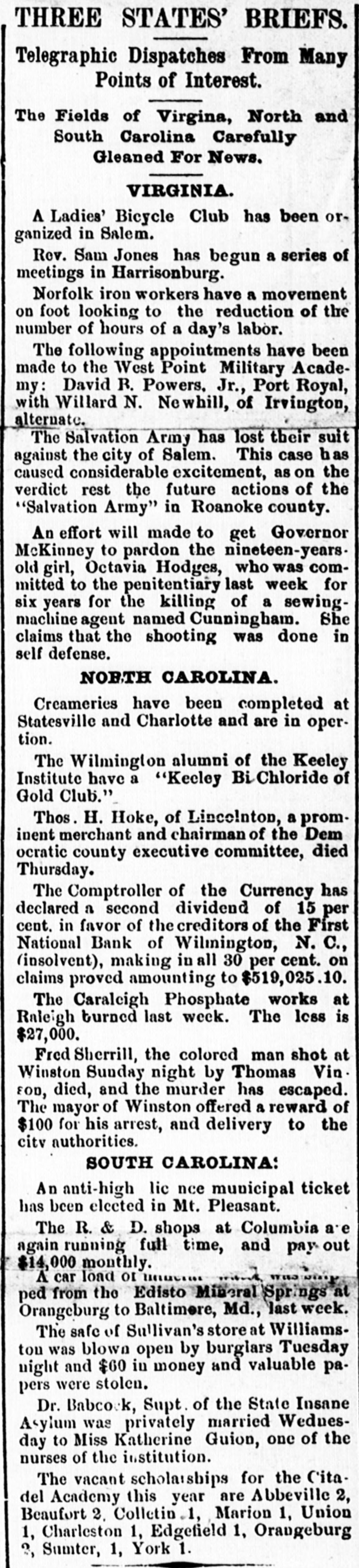 THREE STATES' BRIEFS. Telegraphic Dispatches From Many Points of Interest. The Fields of Virgina, North and South Carolina Carefully Gleaned For News. VIRGINIA. A Ladies' Bicycle Club has been organized in Salem. Rev. Sam Jones has begun a series of meetings in Harrisonburg. Norfolk iron workers have a movement on foot looking to the reduction of the number of hours of a day's labor. The following appointments have been made to the West Point Military Academy: David R. Powers. Jr., Port Royal, with Willard N. Newhill, of Irvington, alternate. The Salvation Army has lost their suit against the city of Salem. This case has caused considerable excitement, as on the verdict rest the future actions of the "Salvation Army" in Roanoke county. An effort will made to get Governor McKinney to pardon the nineteen-years. old girl, Octavia Hodges, who was committed to the penitentiary last week for six years for the killing of a sewingmachine agent named Cunningbam. She claims that the shooting was done in self defense. NORTH CAROLINA. Creameries have been completed at Statesville and Charlotte and are in opertion. The Wilmington alumni of the Keeley Institute have a "Kecley Bi Chloride of Gold Club." Thos. H. Hoke, of Lincolnton, a prominent merchant and chairman of the Dem ocratic county executive committee, died Thursday. The Comptroller of the Currency has declared a second dividend of 15 per cent. in favor of the creditors of the First National Bank of Wilmington, N.C., (insolvent), making in all 30 per cent. on claims proved amounting to $519,025.10. The Caraleigh Phosphate works at Raleigh turned last week. The less is $27,000. Fred Sherrill, the colored man shot at Winston Sunday night by Thomas Vin. FOD, died, and the murder has escaped. The mayor of Winston offered a reward of $100 for his arrest, and delivery to the city authorities. SOUTH CAROLINA: An anti-high lic nce municipal ticket has been elected in Mt. Pleasant. The R. & D. shops at Columbia are again running full time, and pay out $14,000 monthly. A car load or ped from the Edisto Mineral Springs at Orangeburg to Baltimere, Md., last week. The safe of Sullivan's store at Williamstou was blown open by burglars Tuesday night and $60 in money and valuable papers were stolen. Dr. Babcock, Supt. of the State Insane Asylum was privately married Wednesday to Miss Katherine Guion, one of the nurses of the institution. The vacant scholarships for the Cita. del Academy this year are Abbeville 2, Beaufort 2. Colletin 1, Marion 1, Union 1, Charleston 1, Edgefield 1, Orangeburg 3, Sumter, 1, York 1.