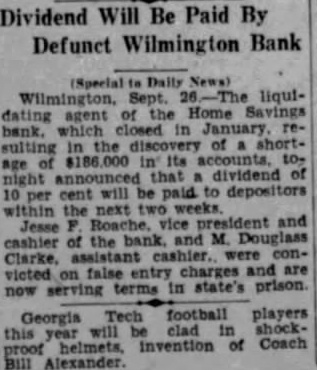 Dividend Will Be Paid By Defunct Wilmington Bank Daily Sept. liquiagent the Home Savings bank. which closed reage $186,000 dividend be paid depositors within the two weeks vice and Jesse of the and M. charges and serving terms in state's Tech football players Georgia clad shockthis of Coach Alexander.