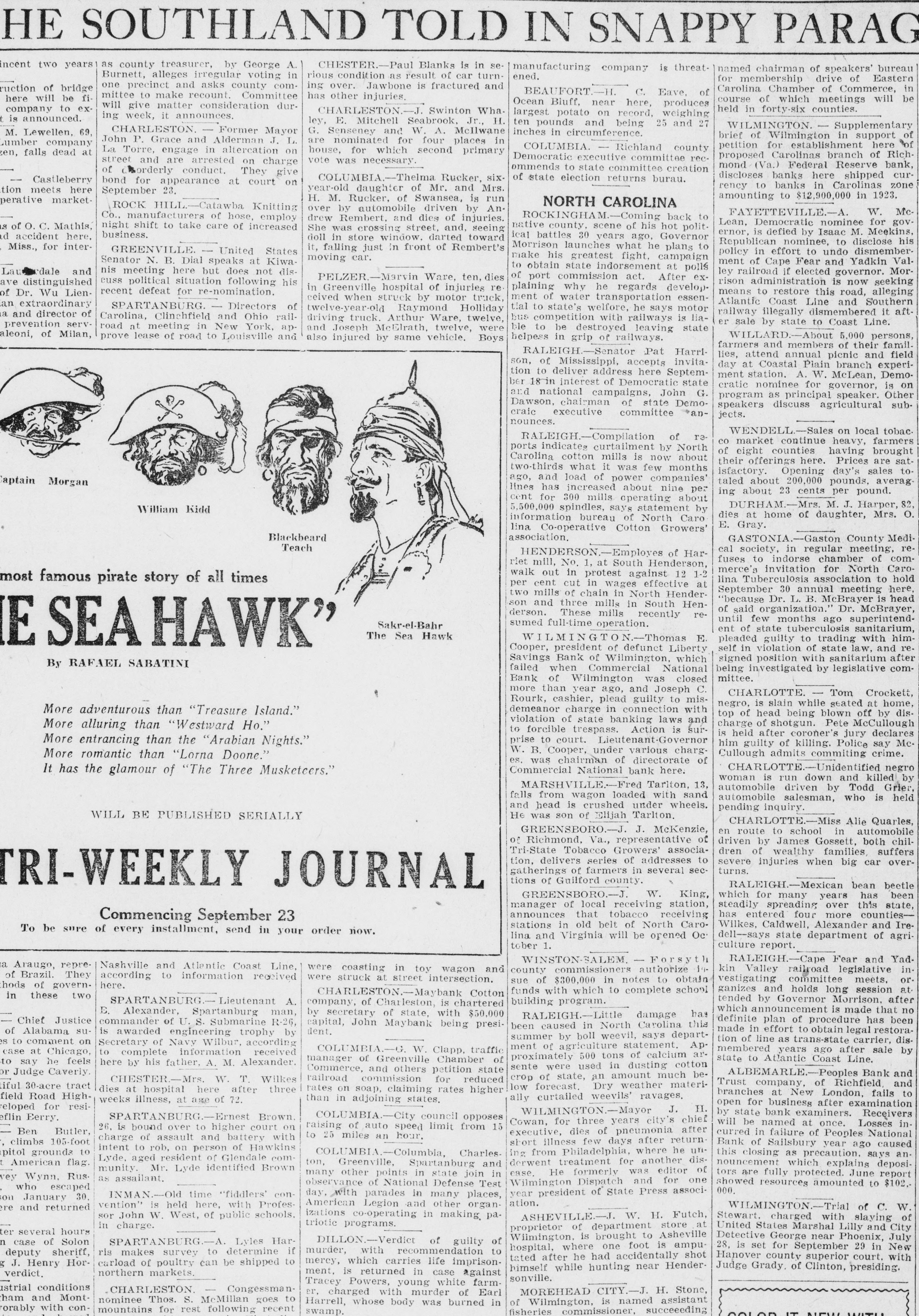SOUTHLAND TOLD IN SNAPPY PARAG two CHESTER.-Paul Blanks is in seyears as county treasurer, by George A. manufacturing company is threatnamed chairman of speakers' bureau rious condition as result of car turnBurnett, alleges irregular voting in ened. for membership drive of Eastern ing over. Jawbone is fractured and one precinct and asks county comof bridge Carolina Chamber of Commerce, in C. BEAUFORT.-H. of Eave, mittee to make recount. Committee has other injuries. be will fihere course of which meetings will be Ocean Bluff, near here, produces will give matter consideration durto excompany held in forty-six counties. CHARLESTON.-J. Swinton Wha. largest potato on record, weighing ing week, it announces. announced. is ley, E. Mitchell Seabrook. Jr., H. ten pounds and being 25 and 27 WILMINGTON. Supplementary G. Senseney and W. A. McIlwane CHARLESTON Former Mayor M. 69, Lewellen, inches in circumference. brief of Wilmington in support of John P. Grace and Alderman J. L. are nominated for four places in Lumber company petition for establishment here of COLUMBIA. Richland county La Torre, engage in altercation on house, for which second primary at dead falls proposed Carolinas branch of RichDemocratic executive committee recvote was necessary. street and are arrested on charge mond (Va.) Federal Reserve bank, ommends to state committee creation of orderly conduct. They give discloses banks here shipped curof state election returns burau. COLUMBIA.-Thelma Rucker, sixCastleberry bond for appearance at court on rency to banks in Carolinas zone year-old daughter of Mr. and Mrs. meets here September 23. amounting to $12,900,000 in 1923. H. M. Rucker, of Swansea, is run marketperative NORTH CAROLINA ROCK HILL.-Catawba Knitting over by automobile driven by AnFAYETTEVILLE.-A. W. McROCKINGHAM.-Coming back to Co., manufacturers of hose, employ drew Rembert, and dies of injuries. Lean, Democratic nominee for govof C. O. night shift to take care of increased Mathis, native county, scene of his hot polit. She was crossing street, and, seeing ernor, is defied by Isaac M. Meekins, business. accident here. ical battles 30 years ago, Governor doll in store window. darted toward Republican nominee, to disclose his for interMorrison launches what he plans to Miss., it, falling just in front of Rembert's GREENVILLE. United States policy in effort to undo dismembermake his greatest fight, campaign moving car. Senator N. B. Dial speaks at Kiwament of Cape Fear and Yadkin Valto obtain state indorsement at polls dale and nis meeting here but does not disley railroad if elected governor. Morof port commission act. After exPELZER.-Marvin Ware, ten, dies rison administration is now seeking cuss political situation following his distinguished in Greenville hospital of injuries re. plaining why he regards developrecent defeat for re-nomination. of Lienmeans to restore this road, alleging Wu Dr. ment of water transportation essenceived when struck by motor truck, Atlantic Coast Line and Southern extraordinary SPARTANBURG. - Directors of tial to state's welfore, he says motor twelve-year-old Raymond Holliday railway illegally dismembered it aftof and director Carolina, Clinchfield and Ohio railbus competition with railways is liadriving truck. Arthur Ware, twelve, er sale by state to Coast Line. prevention servroad at meeting in New York, apand Joseph McElrath, twelve, were ble to be destroyed leaving state of Milan, WILLARD.-About 5,000 persons, prove lease of road to Louisville and helpess in grip of railways. also injured by same vehicle. Boys farmers and members of their famil. RALEIGH.-Senator Pat Harrilies, attend annual picnic and field son, of Mississippi, accepts invitaday at Coastal Plain branch experition to deliver address here Septemment station. A. W. McLean, Demober interest of Democratic state cratic nominee for governor, is on and national campaigns, John G. program as principal speaker. Other Dawson, chairman of state Demospeakers discuss agricultural subcraic executive committee *anjects. nounces. WENDELL.-Sales on local tobac. RALEIGH.-Compilation of reCO market continue heavy, farmers ports indicates curtailment by North of eight counties having brought Carolina cotton mills is now about their offerings here. Prices are sattwo-thirds what it was few months isfactory. Opening day's sales toago, and load of power companies' aptain taled about 200,000 pounds, averagMorgan lines has increased about nine per ing about 23 cents per pound. cent for 300 mills operating about DURHAM.-Mrs. M. J. Harper, 82, William Kidd 5,500,000 spindles, says statement by dies at home of daughter, Mrs. O. information bureau of North Caro E. Gray. lina Co-operative Cotton Growers' association. Blackbeard GASTONIA.-Gaston County MediTeach cal society, in regular meeting, reHENDERSON.-Emplo of Harfuses to indorse chamber of comriet mill, No. 1, at South Henderson, merce's invitation for North Carowalk out in protest against 12 1-2 lina Tuberculosis association to hold most famous pirate story of all times per cent cut in wages effective at September 30 annual meeting here, two mills of chain in North Hender"because Dr. L. B. McBrayer is head son and three mills in South Henof said organization." Dr. McBrayer, derson. These mills recently reuntil few months ago superintendsumed full-time operation. Sakr-el-Bahr ent of state tuberculosis sanitarium, The Sea Hawk WILMINGTON-Thomas E. pleaded guilty to trading with himSEA self in violation of state law, and re. Cooper, president of defunct Liberty signed position with sanitarium after Savings Bank of Wilmington, which By RAFAEL SABATINI failed when Commercial National being investigated by legislative committee. Bank of Wilmington was closed more than year ago, and Joseph C. CHARLOTTE. Tom Crockett, Rourk, cashier, plead guilty to misnegro, is slain while seated at home, demeanor charge in connection with More adventurous than "Treasure Island." top of head being blown off by disvi