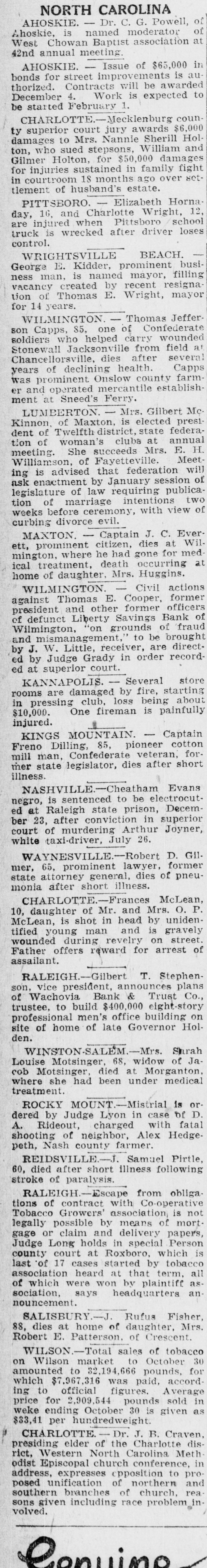 NORTH CAROLINA AHOSKIE. Dr. C. G. Powell, of Ahoskie, is named moderator of West Chowan Baptist association at 42nd annual meeting. AHOSKIE. Issue of $65,000 in bonds for street improvements is authorized. Contracts will be awarded December 4. Work is expected to be started February 1. CHARLOTTE.-Mecklenburg county superior court jury awards $6,000 damages to Mrs. Nannie Sherill Holton, who sued stepsons, William and Gilmer Holton, for $50,000 damages for injuries sustained in family fight in courtroom 18 months ago over settlement of husband's estate. PITTSBORO. Elizabeth Hornaday, 16. and Charlotte Wright, 12, are injured when Pittsboro school truck is wrecked after driver loses control. WRIGHTSVILLE BEACH. George E. Kidder, prominent business man, is named mayor, filling vacancy created by recent resigna tion of Thomas E. Wright, mayor for 14 years. WILMINGTON Thomas Jeffer son Capps, 85. one of Confederate soldiers who helped carry wounded Stonewall Jacksonville from field at Chancellorsville, dies after several years of declining health. Capps was prominent Onslow county farmer and operated mercantile establish ment at Sneed's Ferry. LUMBERTON. Mrs. Gilbert McKinnon, of Maxton, is elected presi dent of Twelfth district, state federation of woman's clubs at annual meeting. She succeeds Mrs. E. H. Williamson, of Fayetteville. Meet ing is advised that federation will ask enactment by January session of legislature of law requiring publication of marriage intentions two weeks before ceremony, with view of curbing divorce evil. MAXTON. Captain J. C. Everett, prominent citizen, dies at Wilmington, where he had gone for med ical treatment, death occurring at home of daughter. Mrs. Huggins. WILMINGTON. Civil actions against Thomas E. Cooper, former president and other former officers of defunct Liberty Savings Bank of Wilmington, "on grounds of fraud and mismanagement," to be brought by J. W. Little, receiver, are directed by Judge Grady in order recorded at superior court. KANNAPOLIS. Several store rooms are damaged by fire, starting in pressing club, loss being about $10,000. One fireman is painfully injured. KINGS MOUNTAIN. Captain Freno Dilling, 85, pioneer cotton mill man, Confederate veteran, former state legislator, dies after short illness. NASHVILLE.-Cheatham Evans negro, is sentenced to be electrocuted at Raleigh state prison, December 23, after conviction in superior court of murdering Arthur Joyner, white taxi-driver, July 26. WAYNESVILLE.-Robert D. Gilmer, 65, prominent lawyer, former state attorney general, dies of pneumonia after short illness. CHARLOTTE.-Frances McLean, 10, daughter of Mr. and Mrs. O. P. McLean, is shot in head by unidentified young man and is gravely wounded during revelry on street Father offers reward for arrest of assailant. RALEIGH.-Gilbert T. Stephenson, vice president, announces plans of Wachovia Bank & Trust Co., trustee, to build $400,000 eight-story professional men's office building on site of home of late Governor Holden. WINSTON-SALEM.-Mrs. Surah Louise Motsinger, 68, widow of Ja. cob Motsinger, died at Morganton where she had been under medical treatment. ROCKY MOUNT.-Mistrial is ordered by Judge Lyon in case of D. A. Rideout, charged with fatal shooting of neighbor, Alex Hedgepeth, Nash county farmer. REIDSVILLE.-J. Samuel Pirtle, 60, died after short illness following stroke of paralysis. RALEIGH.-Escae from obliga tions of contract with Co-operative Tobacco Growers' association is not legally possible by means of mortgage or claim and delivery papers, Judge Long holds in special Person county court at Roxboro, which is last of 17 cases started by tobacco association heard at that term, all of which were won by plaintiff association, says headquarters announcement. SALISBURY.-J. Rufus Fisher, 88, dies at home of daughter, Mrs. Robert E. Patterson. of Crescent. WILSON.-Total sales of tobacco on Wilson market to October 30 amounted to 32,194,666 pounds, for which $7,967,316 was paid, according to official figures. Average price for 2,909,544 pounds sold in weke ending October 30 is given as $33,41 per hundredweight. CHARLOTTE Dr. J. B. Craven, presiding elder of the Charlotte disrict, Western North Carolina Meth odist Episcopal church conference, in address, expresses opposition to proposed unification of northern and southern branches of church, rea sons given including race problem in volved. Conuino