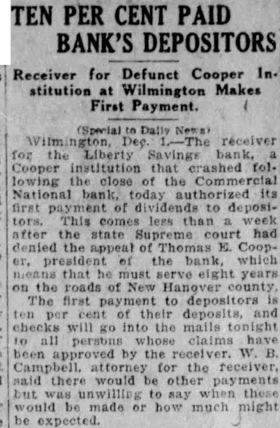 TEN PER CENT PAID BANK'S DEPOSITORS Receiver for Defunct Cooper In. stitution at Wilmington Makes First Payment. Daily News) receiver for the Liberty Savings bank, Cooper institution that crashed fol. lowing the the Commercial National today authorized its first of dividends to depositors. This comes less than week after the state Supreme court had denied the appeal Thomas E. Cooper, president of the bank, which must serve eight years on the roads New The first to depositors is per of their deposits, and checks will go into the mails tonight to all persons whose claims have been by the W. attorney for the receiver, said there would be other payments but was unwilling to say when these would be made or how much might be expected.