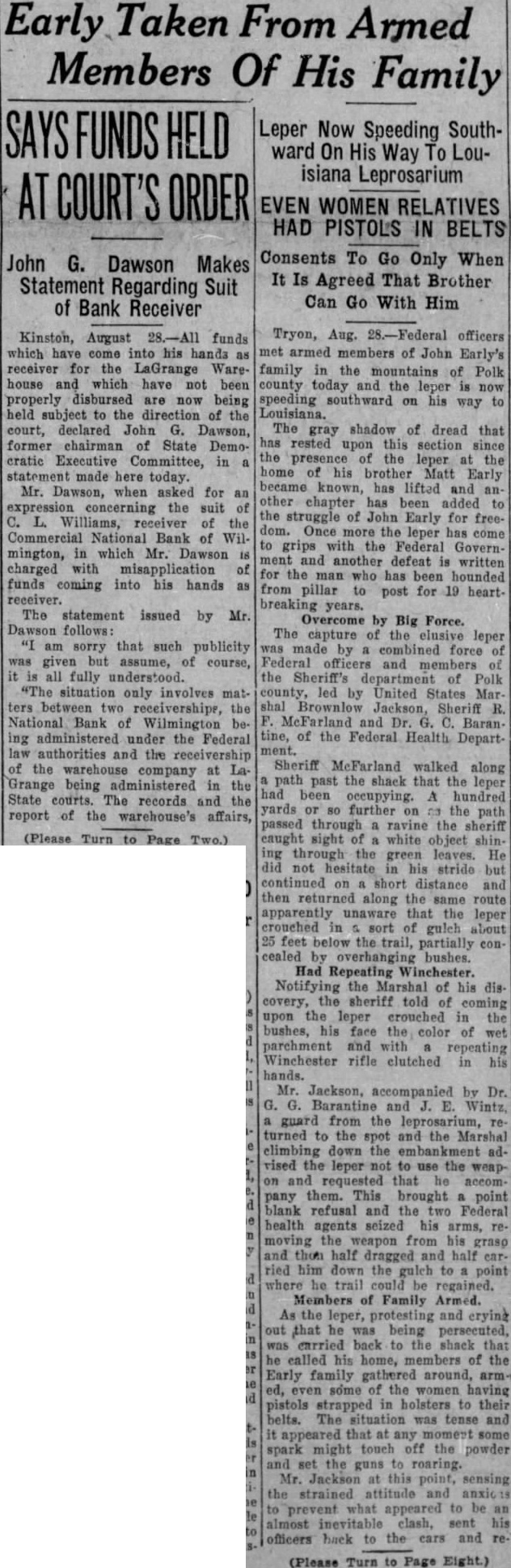 Early Taken From Armed Members Of His Family COURT'S John G. Dawson Makes Statement Regarding Suit of Bank Receiver Kinston, August funds which have come into his hands receiver for the LaGrange Warehouse and which have not been properly are now being subject to of the court, declared Dawson, former chairman of State Democratic Executive Committee, made today. Mr. Dawson, when asked for the Bank mington, which Mr. Dawson charged misapplication funds coming into his hands The statement issued by Mr. Dawson follows: sorry that such publicity was given assume, course, all fully understood. "The situation involves between National Bank Wilmington administered under the Federal authorities and the receivership company Grange being administered the State courts. records report of the warehouse's affairs, (Please Turn Page Two.) Leper Now Speeding Southward On His Way To Louisiana Leprosarium EVEN WOMEN RELATIVES HAD PISTOLS IN BELTS Consents To Go Only When It Is Agreed That Brother Can Go With Him Tryon, Aug. officers armed of John Early's family the mountains of Polk county today and the now speeding southward his The shadow of dread that has rested this section presence the the his brother Matt Early became known, has lifted and chapter has been added the struggle John Early for freeOnce the leper grips with Federal Governanother defeat written for the has been hounded from pillar post for heartyears. Overcome Big Force. The capture elusive leper combined force Federal officers and members Sheriff's Polk county, led by United States Mar Brownlow Jackson, and Dr. the Federal Health DepartSheriff McFarland walked along path past the shack that the leper been occupying. hundred yards further the path passed through ravine the sheriff eaught sight white through the green leaves. hesitate stride continued on short distance then returned along the same route apparently unaware that the leper crouched of gulch about feet below the trail, partially concealed bushes. Repeating Winchester. Notifying the Marshal of disthe sheriff coming upon the leper crouched in bushes, his face color of parchment repeating Winchester rifle clutched Mr. accompanied by Dr. Barantine and Wintz, guard from the leprosarium, turned to the and the Marshal climbing down vised to the weaprequested pany them. This brought point blank refusal and the two Federal health agents seized his arms, moving the weapon from his and then half dragged and half ried him down the point where he trail regained. Members Family Armed. the leper, protesting and erying that persecuted, was carried back shack that called his home, members of the Early family gathered around, armsome the women having pistols strapped holsters their belts. The situation was tense and it appeared that moment spark might touch off the powder and set the guns roaring. Mr. Jackson this sensing strained attitude and prevent what appeared be almost inevitable clash, sent officers back to the and (Please Turn to Page Eight.)
