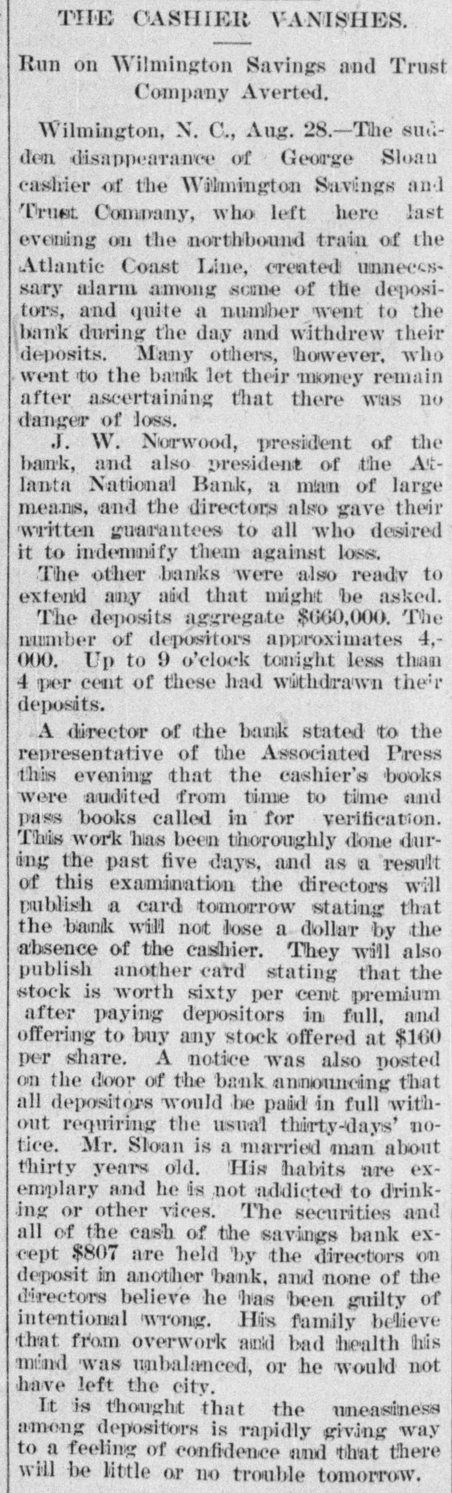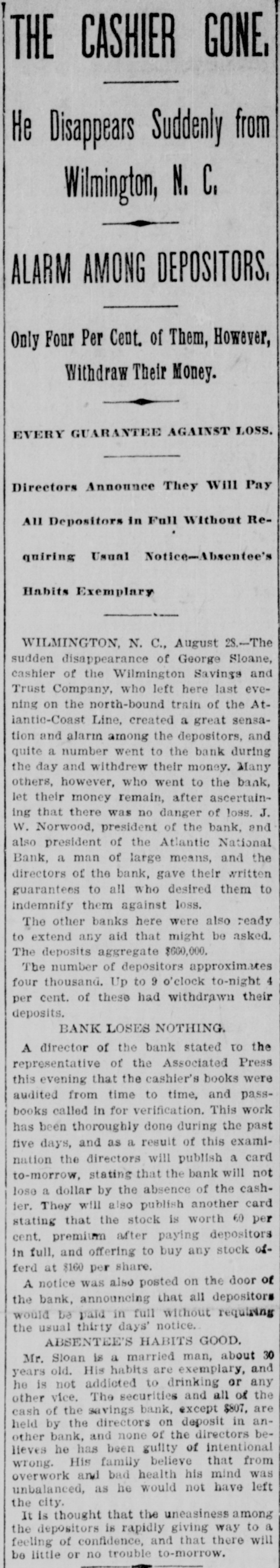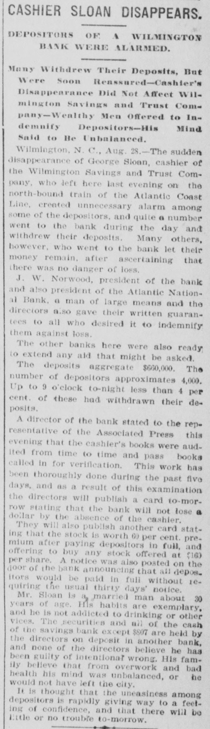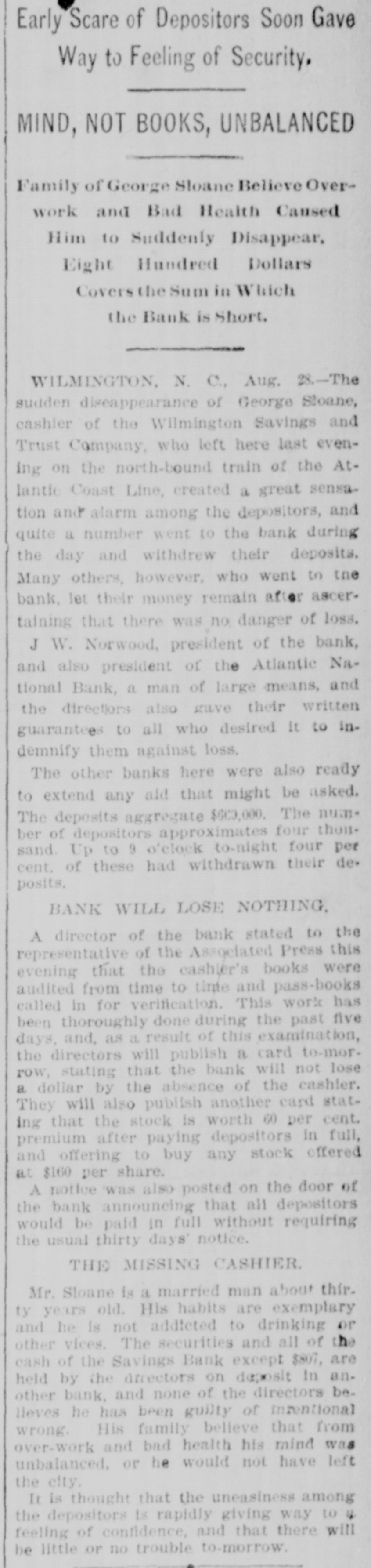 Directors Declare the Bank Will Not Lose a Dollar. MISSING MAN CRAZY, MAYBE Sudden Disappearance of Cashier George Sloane, of the Wilmington, N. C., Savings and Trust Co. Almost Causedia Run on the Bank. (By Telegraph.) (WILMINGTON, N. C., Aug. 28.-The sudden disappearance of George Sloan, cashier of the Wilmington Savings and Trust Company. who left here last evening on the northbound train of the Atlantic Coast Line, created unnecessary alarm among some of the depositors, and quite a number went to the bank during the day and withdrew their deposits. Many others, however. who wen't to the bank let their money remain, after ascertaining that there was no danger of loss. 1 GAVE GUARANTEES. J. W. Norwood, president of the bank, and also president of the Atlantic National Bank. a man of large means, and the directors also gave their written guarantees 'to all who desired it to indemnify them against loss. The other banks here were also ready to extend any aid that might be asked. The deposits aggregate $660,000. The number of depositors approximate four thousand. Up to 9 o'clock tonight less than four per cent of these had withdrawn their deposits. A director of the bank stated to the representative of the Associated Press this evening that the cashier's books were audited from time to time and pass books called in for venification. WILL NOT LOSE A DOLLAR. This work has been thoroughly done during the past five days, and as a result of this examination. the directors will publish a card tomorrow stating that the bank will not lose a dollar by the absence of the cashier. They will also publish another card, showing that the stock is worth 60 per cent. premium after paying depositors in full, and offering to buy any stock offered at one hundred and sixty dollars per share. A notice was also posted on the door of the bank announcing that all depositors would be paid in full without requiring the usual sixty days notice. Mr. Sloan is a married man, about 30 years old. A GOODLY MAN. His habits are exemplary, and he is not addicted to drinking or other vices. The securities and all of the cash of the savings bank except $807 are held by the directors on deposit in another bank, and none of the directors believe he has been guilty of intentional wrong. His family believe that from overwork and bad health his mind was unbalanced. or he would not have left the city. It is thought that the uneasiness among depositors is rapidiy giving way to a feeling of confidence. and tat there will be little or no trouble tomorrow.