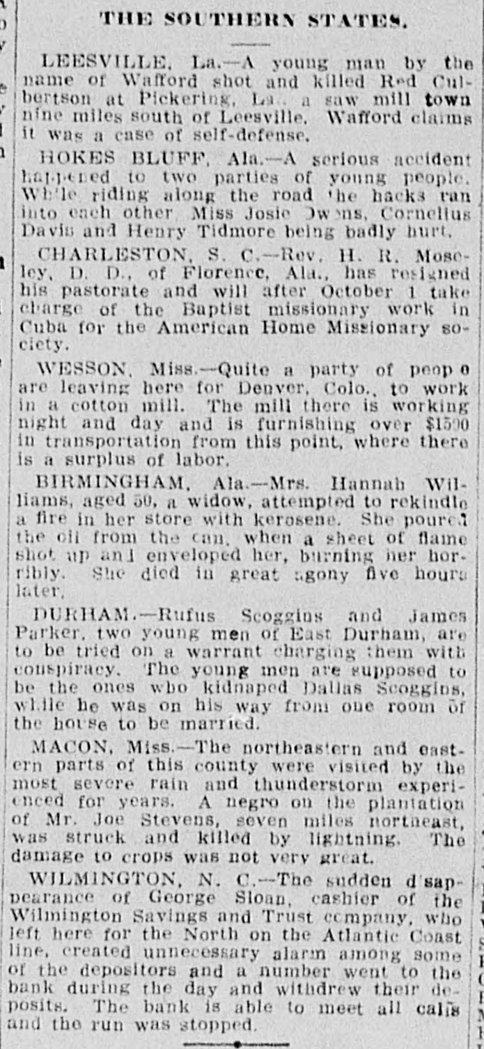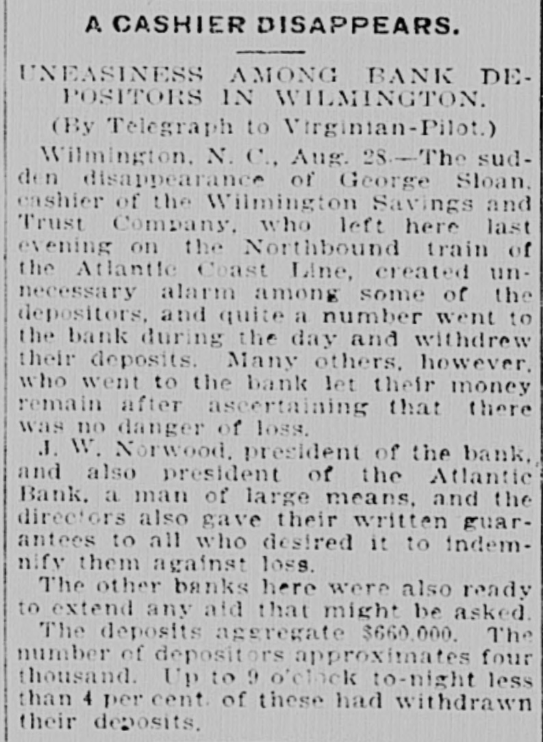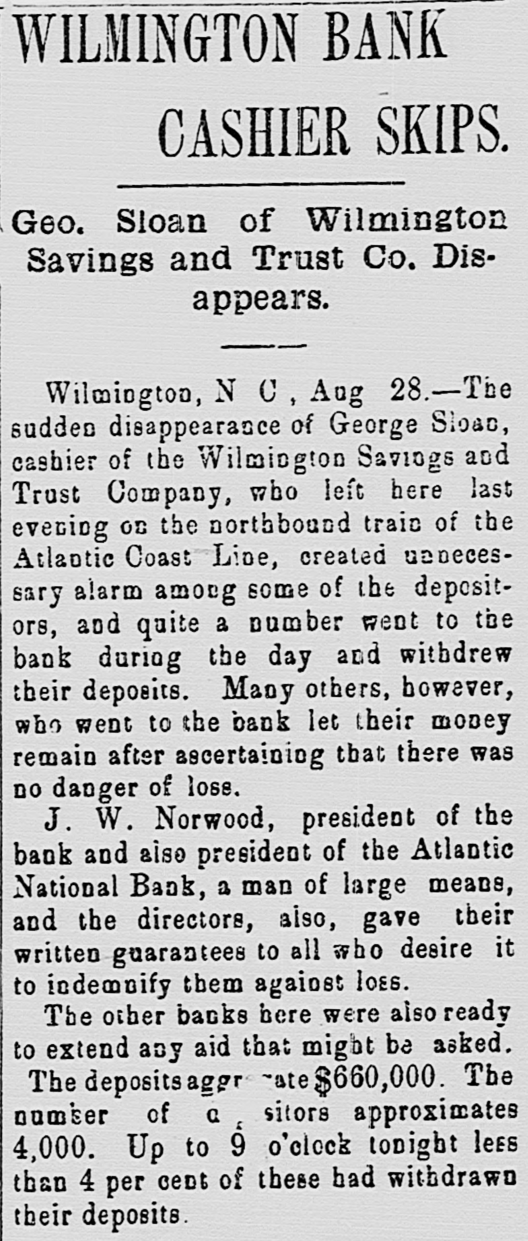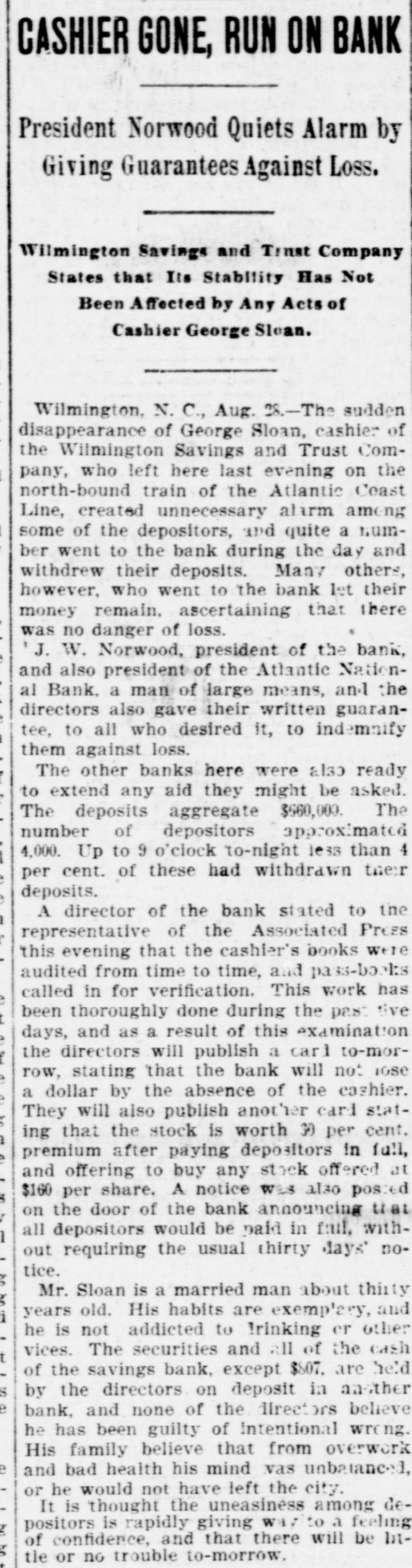 Directors Declare the Bank Will Not Lose a Dollar. MISSING MAN CRAZY, MAYBE Sudden Disappearance of Cashier George Sloane, of the Wilmington, N. C., Savings and Trust Co. Almost Causedia Run on the Bank. (By Telegraph.) (WILMINGTON, N. C., Aug. 28.-The sudden disappearance of George Sloan, cashier of the Wilmington Savings and Trust Company. who left here last evening on the northbound train of the Atlantic Coast Line, created unnecessary alarm among some of the depositors, and quite a number went to the bank during the day and withdrew their deposits. Many others, however. who wen't to the bank let their money remain, after ascertaining that there was no danger of loss. 1 GAVE GUARANTEES. J. W. Norwood, president of the bank, and also president of the Atlantic National Bank. a man of large means, and the directors also gave their written guarantees 'to all who desired it to indemnify them against loss. The other banks here were also ready to extend any aid that might be asked. The deposits aggregate $660,000. The number of depositors approximate four thousand. Up to 9 o'clock tonight less than four per cent of these had withdrawn their deposits. A director of the bank stated to the representative of the Associated Press this evening that the cashier's books were audited from time to time and pass books called in for venification. WILL NOT LOSE A DOLLAR. This work has been thoroughly done during the past five days, and as a result of this examination. the directors will publish a card tomorrow stating that the bank will not lose a dollar by the absence of the cashier. They will also publish another card, showing that the stock is worth 60 per cent. premium after paying depositors in full, and offering to buy any stock offered at one hundred and sixty dollars per share. A notice was also posted on the door of the bank announcing that all depositors would be paid in full without requiring the usual sixty days notice. Mr. Sloan is a married man, about 30 years old. A GOODLY MAN. His habits are exemplary, and he is not addicted to drinking or other vices. The securities and all of the cash of the savings bank except $807 are held by the directors on deposit in another bank, and none of the directors believe he has been guilty of intentional wrong. His family believe that from overwork and bad health his mind was unbalanced. or he would not have left the city. It is thought that the uneasiness among depositors is rapidiy giving way to a feeling of confidence. and tat there will be little or no trouble tomorrow.