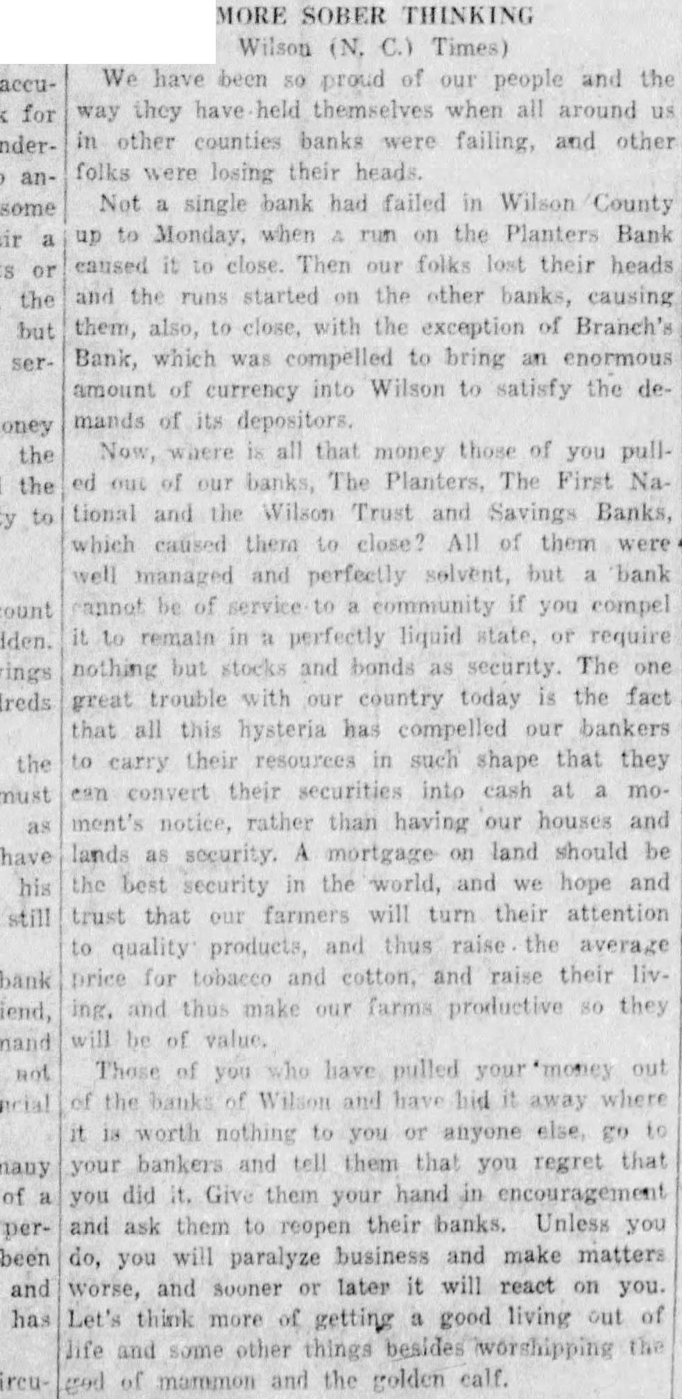 MORE SOBER THINKING Wilson (N, C.) Times) We have been proud of our people and the way they have held themselves when all around us in other counties banks were failing, and other folks were losing their heads. Not single bank had failed in Wilson County up to Monday, when run on the Planters Bank caused close. Then our folks lost their heads and the runs started on the other banks, causing them, also, to close, with the exception of Branch's Bank, which was compelled to bring an enormous amount of currency into Wilson to satisfy the demands of its depositors. Now, that money those of you ed out of our banks, The Planters, The First National and the Wilson Trust and Savings Banks, which caused them to close? All them well managed and perfectly solvent, but bank cannot be of service to community if you compel to remain perfectly liquid state, require nothing but stocks and bonds as security. The great trouble with our country today is the fact that all this hysteria has compelled our bankers carry their resources in such shape that they can convert their securities into cash at moment's notice, rather than having our houses and lands as security. mortgage on land should be the best security the world, and we hope and trust that our farmers will turn their attention quality products, and thus raise the average price for tobacco and cotton, and raise their liv. and thus make our farms productive 80 they be of Those you have pulled your money the banks of and have hid where worth nothing to you anyone else, go your bankers and tell them that you regret that did Give them your hand in encouragement and ask them to reopen their banks. Unless you do, you will paralyze business and make matters worse, and sooner or later it will react on you. Let's think more getting good living out of and some other things besides worshipping of and the golden calf.