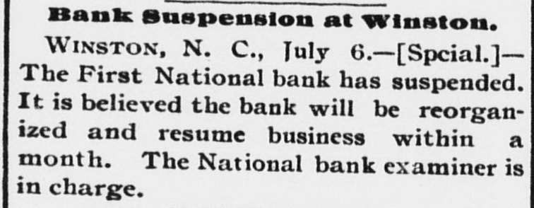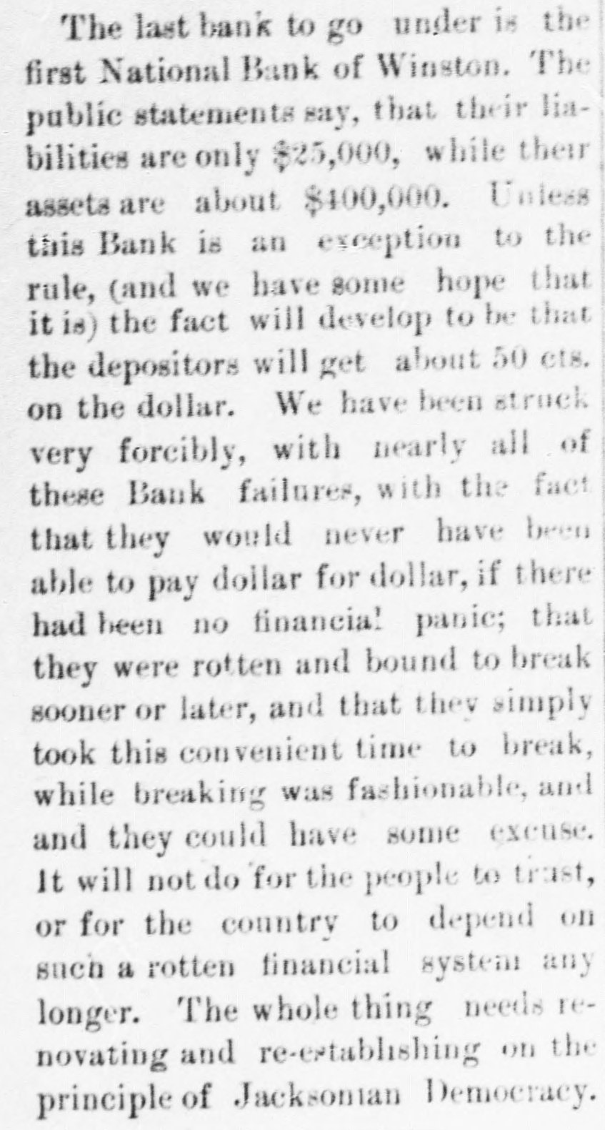 The last bank to go under is the first National Bank of Winston. The public statements say, that their liabilities are only $25,000, while their assets are about $400,000. Unless this Bank is an exception to the rule, (and we have some hope that it is) the fact will develop to be that the depositors will get about 50 ets. on the dollar. We have been struck very forcibly, with nearly all of these Bank failures, with the fact that they would never have been able to pay dollar for dollar, if there had been no financial panic; that they were rotten and bound to break sooner or later, and that they simply took this convenient time to break, while breaking was fashionable, and and they could have some excuse. It will not do for the people to trust, or for the country to depend on such a rotten financial system any longer. The whole thing needs renovating and re-ertablishing on the principle of Jacksoman Democracy.