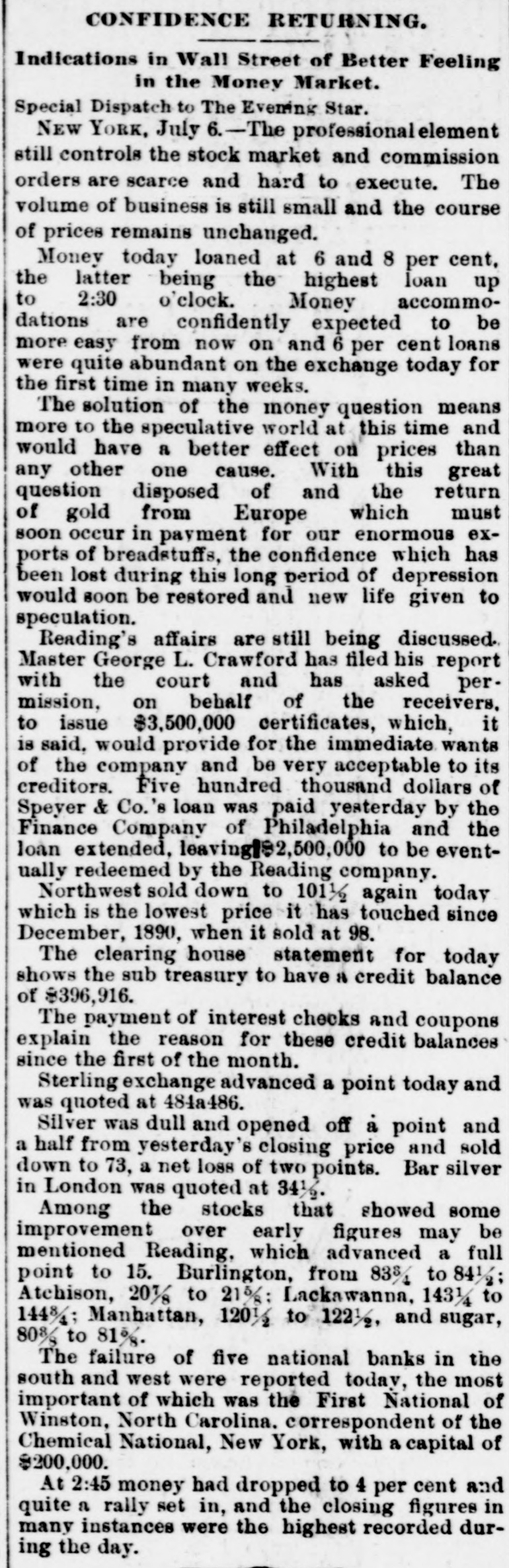 # CONFIDENCE RETURNING. Indications in Wall Street of Better Feeling in the Money Market. Special Dispatch to The Evening Star. NEW YORK, July 6. -The professional element still controls the stock market and commission orders are scarce and hard to execute. The volume of business is still small and the course of prices remains unchanged. Money today loaned at 6 and 8 per cent, the latter being the highest loan up to 2:30 o'clock. Money accommodations are confidently expected to be more easy from now on and 6 per cent loans were quite abundant on the exchange today for the first time in many weeks. The solution of the money question means more to the speculative world at this time and would have a better effect on prices than any other one cause. With this great question disposed of and the return of gold from Europe which must soon occur in payment for our enormous exports of breadstuffs, the confidence which has been lost during this long period of depression would soon be restored and new life given to speculation. Reading's affairs are still being discussed. Master George L. Crawford has filed his report with the court and has asked permission, on behalf of the receivers, to issue $3,500,000 certificates, which, it is said, would provide for the immediate wants of the company and be very acceptable to its creditors. Five hundred thousand dollars of Speyer & Co.'s loan was paid yesterday by the Finance Company of Philadelphia and the loan extended, leaving $2,500,000 to be eventually redeemed by the Reading company. Northwest sold down to 101½ again today which is the lowest price it has touched since December, 1890, when it sold at 98. The clearing house statement for today shows the sub treasury to have a credit balance of $396,916. The payment of interest checks and coupons explain the reason for these credit balances since the first of the month. Sterling exchange advanced a point today and was quoted at 484a486. Silver was dull and opened off a point and a half from yesterday's closing price and sold down to 73, a net loss of two points. Bar silver in London was quoted at 34½. Among the stocks that showed some improvement over early figures may be mentioned Reading, which advanced a full point to 15. Burlington, from 83¾ to 84½; Atchison, 20⅞ to 21⅛; Lackawanna, 143¼ to 144⅞; Manhattan, 120½ to 122½, and sugar, 80⅝ to 81⅛. The failure of five national banks in the south and west were reported today, the most important of which was the First National of Winston, North Carolina, correspondent of the Chemical National, New York, with a capital of $200,000. At 2:45 money had dropped to 4 per cent and quite a rally set in, and the closing figures in many instances were the highest recorded during the day.