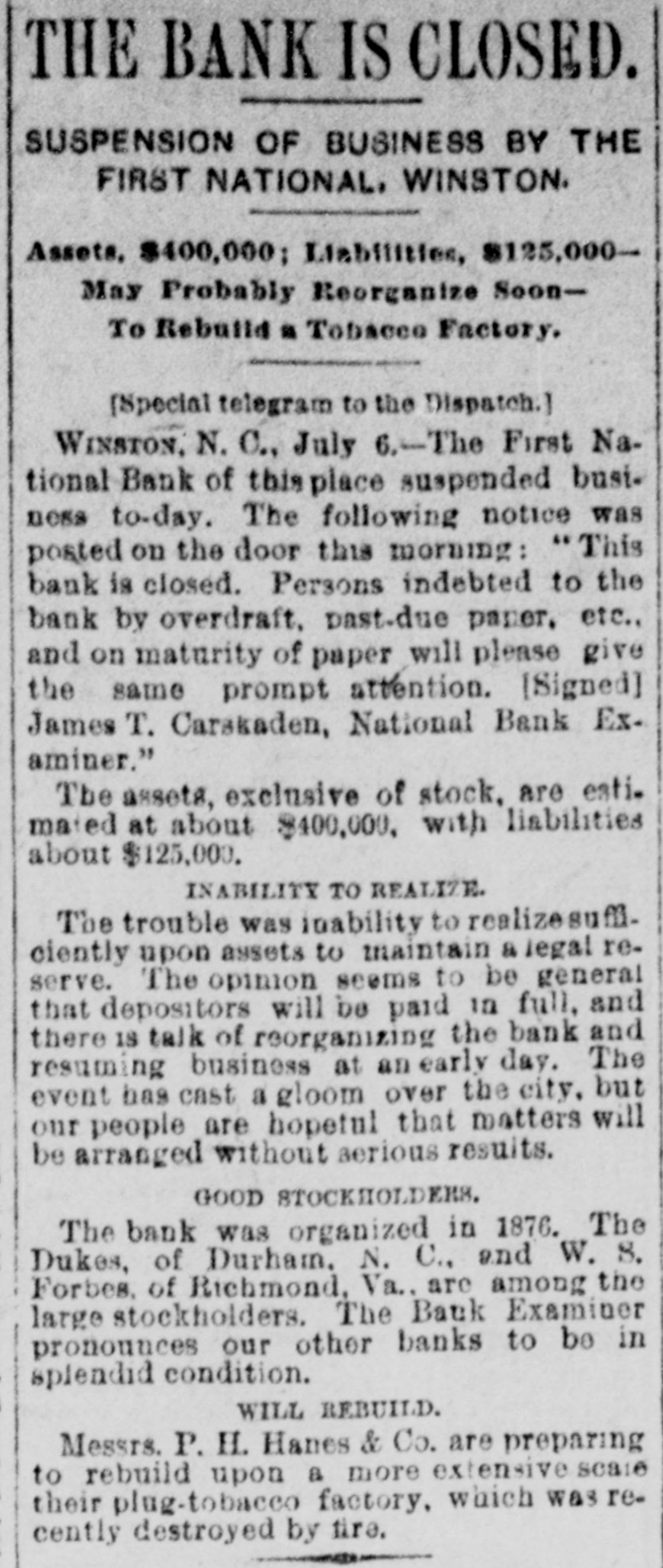 THE BANK IS CLOSED. SUSPENSION OF BUSINESS BY THE FIRST NATIONAL, WINSTON. Assets, $400,000; Liabilities, $125,000-May Probably Reorganize SoonTo Rebuild a Tobacco Factory. (Special telegram to the Dispatch.) WINSTON. N. C., July 6. -The First National Bank of this place suspended business to-day. The following notice was posted on the door this morning: "This bank is closed. Persons indebted to the bank by overdraft, past-due paper. etc., and on maturity of paper will please give the same prompt attention. [Signed] James T. Carakaden, National Bank Ex. aminer." The assets, exclusive of stock, are esti. maied at about $400,000. with liabilities about $125,000. INABILITY TO REALIZE. The trouble was liability to realizesufficiently upon assets to maintain a legal reserve. The opinion seems to be general that depositors will be paid in full. and there IS talk of reorganizing the bank and resuming business at an early day. The event has cast a gloom over the city, but our people are hopeful that matters will be arranged without aerious results. GOOD STOCKHOLDERS. The bank was organized in 1876. The Dukes, of Durham, N. C., and W. 8. Forbes, of Richmond, Va.. are among the large stockholders. The Bauk Examiner pronounces our other banks to be in splendid condition. WILL REBUILD. Messrs. P. H. Hanes & Co. are preparing to rebuild upon a more extensive scale their plug-tobacco factory. which was recently destroyed by fire.