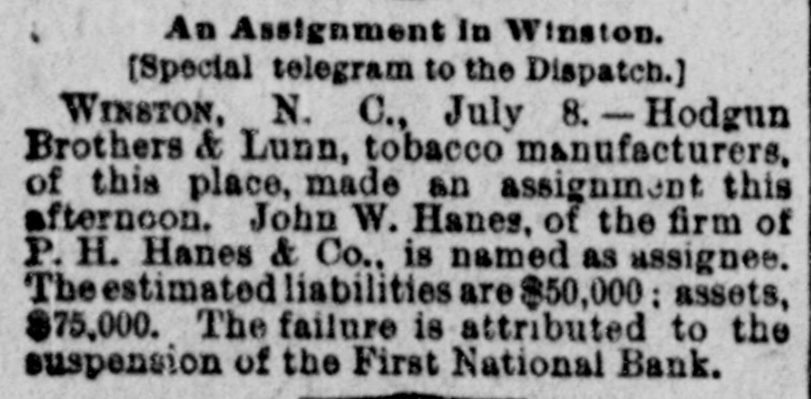An Assignment In Winston. (Special telegram to the Dispatch.) WINSTON. N. C., July 8. - Hodgun Brothers & Lunn, tobacco manufacturers, of this place, made an assignment this afternoon. John W. Hanes, of the firm of P. * H. Hanes & Co., is named as assignee. Theestimated liabilities are $50,000 : assets, $75,000. The failure is attributed to the suspension of the First National Bank.