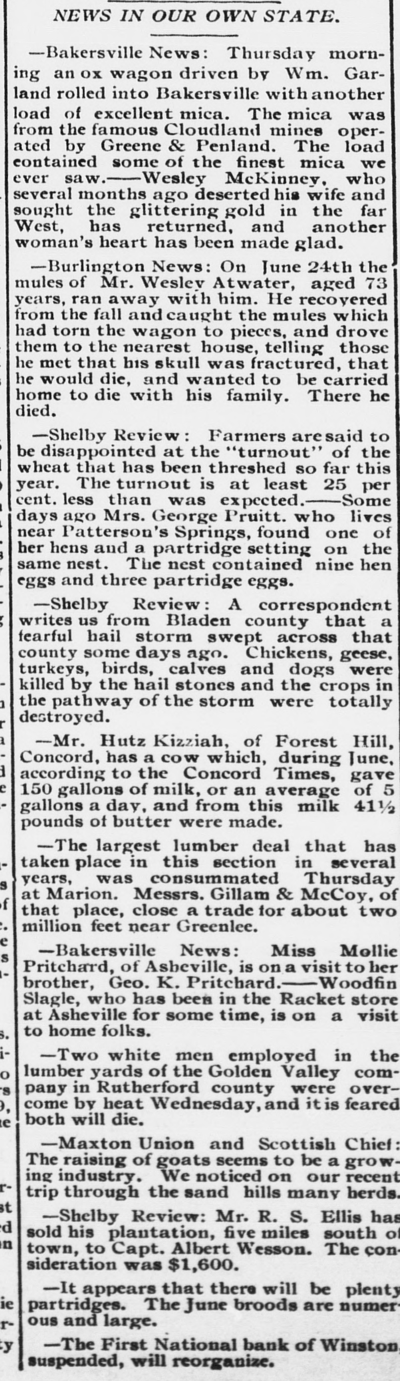 NEWS IN OUR OWN STATE. -Bakersville News: Thursday morning an ox wagon driven by Wm. Garland rolled into Bakersville with another load of excellent mica. The mica was from the famous Cloudland mines operated by Greene & Penland. The load contained some of the finest mica we ever saw.-Wesley McKinney, who several months ago deserted his wife and sought the glittering gold in the far West, has returned, and another woman's heart has been made glad. -Burlington News: On June 24th the mules of Mr. Weslev Atwater, aged 73 years, ran away with him. He recovered from the fall and caught the mules which had torn the wagon to pieces, and drove them to the nearest house, telling those he met that his skull was fractured, that he would die, and wanted to be carried home to die with his family. There he died. -Shelby Review: Farmers aresaid to be disappointed at the "turnout" of the wheat that has been threshed so far this year. The turnout is at least 25 per cent. less than was expected.- Some days ago Mrs. George Pruitt. who lives near Patterson's Springs, found one of her hens and a partridge setting on the same nest. The nest contained nine hen eggs and three partridge eggs. -Shelby Review: A correspondent writes us from Bladen county that a fearful hail storm swept across that county some days ago. Chickens, geese, turkeys, birds, calves and dogs were killed by the hail stones and the crops in h the pathway of the storm were totally destroyed. r a -Mr. Hutz Kizziah, of Forest Hill, Concord, has a cow which, during June, d according to the Concord Times, gave e 150 gallons of milk, or an average of 5 gallons a day, and from this milk 411/2 pounds of butter were made. -The largest lumber deal that has taken place in this section in several years, was consummated Thursday s at Marion. Messrs. Gillam & McCoy, of f that place, close a trade for about two : million feet near Greenlee. e -Bakersville News: Miss Mollie s Pritchard, of Asheville, is on a visit to her brother, Geo. K. Pritchard.-Woodfin Slagle, who has been in the Racket store at Asheville for some time, is on a visit to home folks. S. i-Two white men employed in the o lumber yards of the Golden Valley com's pany in Rutherford county were over9, come by heat Wednesday, and it is feared both will die. e -Maxton Union and Scottish Chief: : The raising of goats seems to be a growing industry. We noticed on our recent rtrip through the sand hills many berds. st -Shelby Review: Mr. R. S. Ellis has d sold his plantation, five miles south of n town, to Capt. Albert Wesson. The consideration was $1,600. -It appears that there will be plenty ie partridges. The June broods are numer ous and large. r-The First National bank of Winston y suspended, will reorganize.