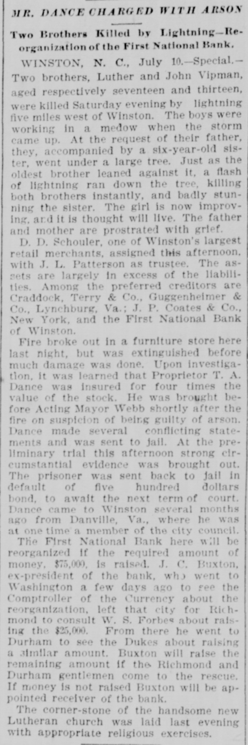 MR. DANCE CHARGED WITH ARSON Two Brothers Killed by Lightning-Reorganization of the First National Bank. WINSTON, N. C., July 10.-Special.Two brothers, Luther and John Vipman, aged respectively seventeen and thirteen, were killed Saturday evening by lightning five miles west of Winston. The boys were working in a medow when the storm came up. At the request of their father, they, accompanied by a six-year-old sister, went under a large tree. Just as the oldest brother leaned against it, a flash of lightning ran down the tree, killing both brothers instantly, and badly stunning the sister. The girl is now improving, and it is thought will live. The father and mother are prostrated with grief. D. D. Schouler, one of Winston's largest retail merchants, assigned this afternoon. with J. L. Patterson as trustee. The assets are largely in excess of the liabilities. Among the preferred creditors are Craddock, Terry & Co., Guggenheimer & Co., Lynchburg, Va.; J. P. Coates & Co., New York, and the First National Bank of Winston. Fire broke out in a furniture store here last night, but was extinguished before much damage was done. Upon investigation, it was learned that Proprietor T. A. Dance was insured for four times the value of the stock. He was brought before Acting Mayor Webb shortly after the fire on suspicion of being guilty of arson. Dance made several conflicting statements and was sent to jail. At the preliminary trial this afternoon strong circumstantial evidence was brought out. The prisoner was sent back to jail in default of five hundred dollars bond, to await the next term of court. Dance came to Winston several months ago from Danville, Va., where he was at one time a member of the city council. The First National Bank here will be reorganized If the required amount of money, $75,000. is raised. J. C. Buxton, ex-president of the bank, who went to Washington a few days ago to fee the Comptroller of the Currency about the reorganization, left that city for Richmond to consult W. S. Forbes about raising the $25,000. From there he went to Durham to see the Dukes about raising a 31mllar amount. Buxton will raise the remaining amount if the Richmond and Durham gentlemen come to the rescue. If money is not raised Buxton will be appointed receiver of the bank. The corner-stone of the handsome new Lutheran church was laid last evening with appropriate religious exercises.