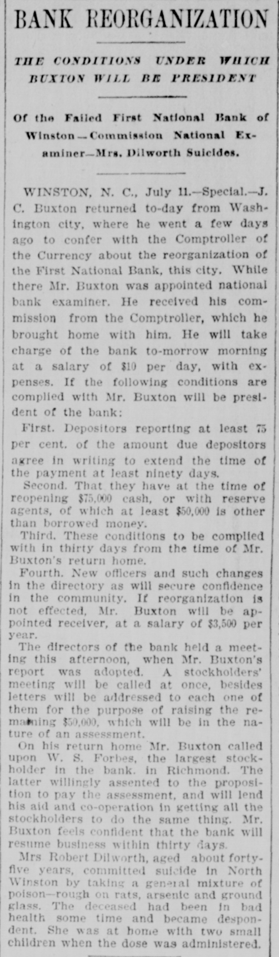 BANK REORGANIZATION THE CONDITIONS UNDER WHICH BUXTON WILL BE PRESIDENT Of the Failed First National Bank of Winston-Commission National Examiner-Mrs. Dilworth Suicides. WINSTON, N. C., July 11.-Special.-J. C. Buxton returned to-day from Washington city, where he went a few days ago to confer with the Comptroller of the Currency about the reorganization of the First National Bank, this city. While there Mr. Buxton was appointed national bank examiner. He received his commission from the Comptroller, which he brought home with him. He will take charge of the bank to-morrow morning at a salary of $10 per day, with expenses. If the following conditions are complied with Mr. Buxton will be prestdent of the bank: First. Depositors reporting at least 75 per cent. of the amount due depositors agree in writing to extend the time of the payment at least ninety days. Second That they have at the time of reopening $75,000 cash, or with reserve agents, of which at least $50,000 is other than borrowed money. Third. These conditions to be complied with in thirty days from the time of Mr. Buxton's return home. Fourth. New officers and such changes in the directory as will secure confidence in the community, If reorganization is not effected, Mr. Buxton will be appointed receiver, at a salary of $3,500 per year. The directors of the bank held a meeting this afternoon, when Mr. Buxton's report was adopted. A stockholders' meeting will be called at once, besides letters will be addressed to each one of them for the purpose of raising the remaining $50,000. which will be in the nature of an assessment. On his return home Mr. Buxton called upon W. S. Forbes, the largest stockholder in the bank. in Richmond. The latter willingly assented to the proposition to pay the assessment, and will lend his aid and co-operation in getting all the stockholders to do the same thing. Mr. Buxton feels confident that the bank will resume business within thirty days. Mrs Robert Dilworth, aged about fortyfive years, committed suicide in North Winston by taking a general mixture of poison-rough on rats, arsenic and ground glass. The deceased had been in bad health some time and became despondent. She was at home with two small children when the dose was administered.