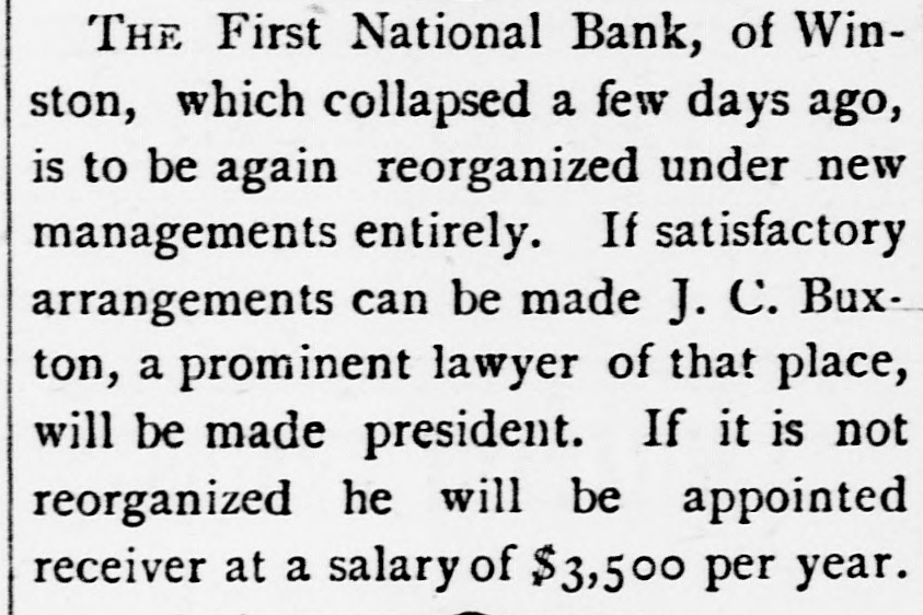 THE First National Bank, of Winston, which collapsed a few days ago, is to be again reorganized under new managements entirely. If satisfactory arrangements can be made J. C. Buxton, a prominent lawyer of that place, will be made president. If it is not reorganized he will be appointed receiver at a salary of $3,500 per year.