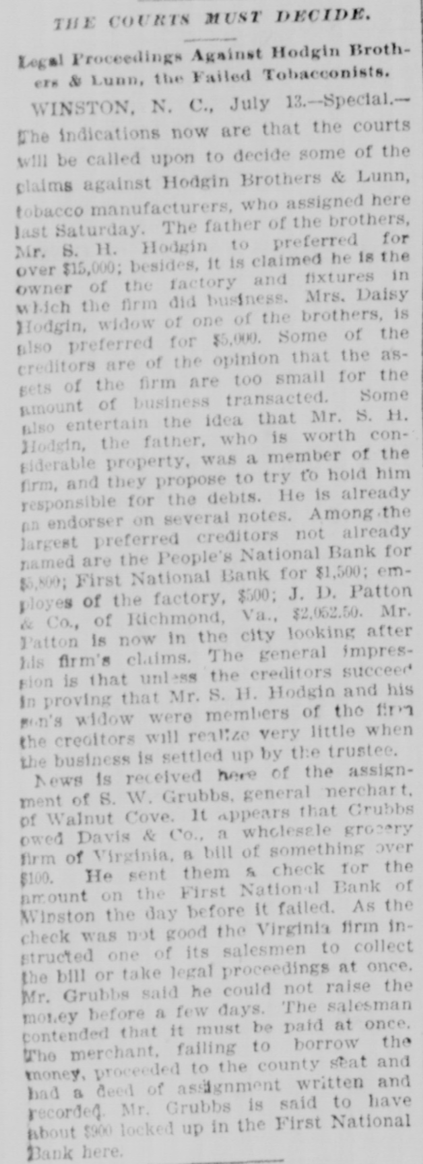 THE COURTS MUST DECIDE. Legal Proceedings Against Hodgin Brothere & Lunn, the Failed Tobacconists. WINSTON, N. C., July 13.-Special.The indications now are that the courts will be called upon to decide some of the claims against Hodgin Brothers & Lunn, tobacco manufacturers, who assigned here last Saturday. The father of the brothers, Mr. S. H. Hodgin to preferred for over $15,000; besides, it is claimed he is the owner of the factory and fixtures in which the firm did business. Mrs. Daisy Hodgin, widow of one of the brothers, is also preferred for $5,000. Some of the creditors are of the opinion that the assets of the firm are too small for the amount of business transacted. Some also entertain the idea that Mr. S. H. Hodgin, the father, who is worth considerable property, was a member of the firm, and they propose to try to hold him responsible for the debts. He is already pn endorser on several notes. Among the largest preferred creditors not already named are the People's National Bank for $5,800; First National Bank for $1,500; employes of the factory, $500; J. D. Patton & Co., of Richmond, Va., $2,052.50. Mr. Patton is now in the city looking after his firm's claims. The general impression is that unless the creditors succeed in proving that Mr. S. H. Hodgin and his sun's widow were members of the firm the creditors will realize very little when the business is settled up by the trustee. News is received here of the assignment of S. W. Grubbs, general merchart, of Walnut Cove. It appears that Grubbs owed Davis & Co., a wholesale grocery firm of Virginia, B bill of something over sent them & on the First $100. amount He National check Bank for the the of Winston the day before it failed. As check was not good the Virginia firm instructed one of its salesmen to collect the bill or take legal proceedings at once. Mr. Grubbs said he could not raise the money before a few days. The salesman contended that it must be paid at once, The merchant, failing to borrow the money, proceeded to the county seat and had a deed of assignment written and recorded Mr. Grubbs is said to have about $900 locked up in the First National Bank here.