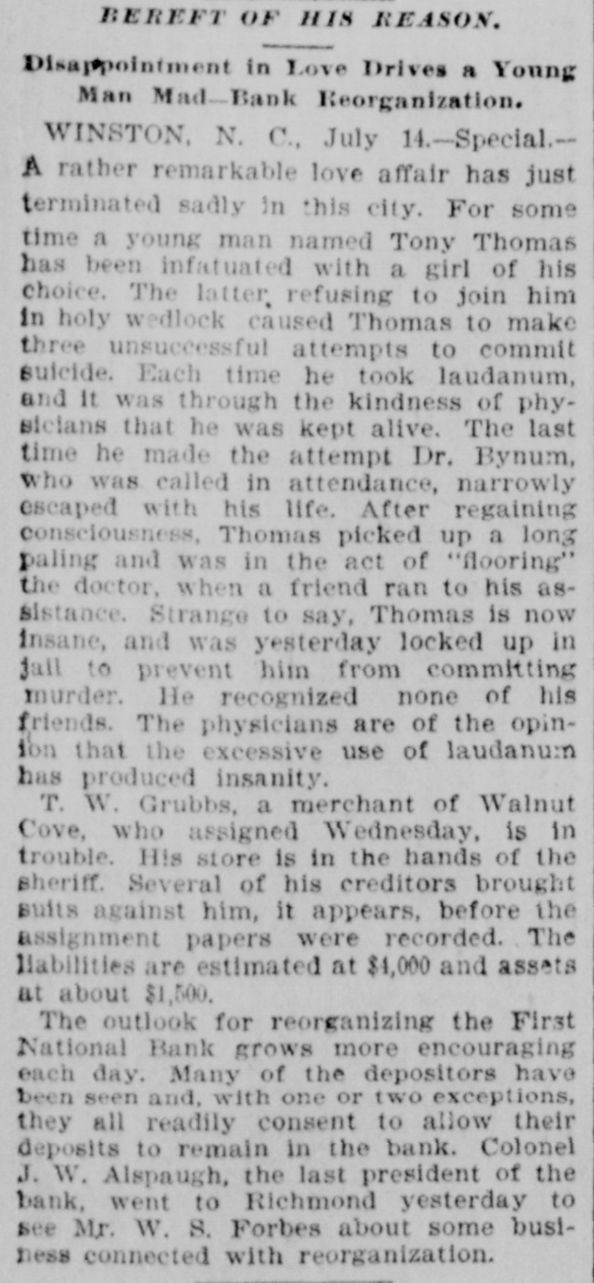 BEREFT OF HIS REASON. Disappointment in Love Drives a Young Man Mad-Bank Reorganization. WINSTON N. C., July 14.-Special.A rather remarkable love affair has just terminated sadly in this city. For some time a young man named Tony Thomas has been infatuated with a girl of his choice. The latter refusing to join him in holy wedlock caused Thomas to make three unsuccessful attempts to commit suicide. Each time he took laudanum, and It was through the kindness of physicians that he was kept alive. The last time he made the attempt Dr. Bynum, who was called in attendance, narrowly escaped with his life. After regaining consciousness, Thomas picked up a long paling and was in the act of "flooring" the doctor, when a friend ran to his assistance. Strange to say, Thomas is now Insane, and was yesterday locked up in fall to prevent him from committing murder. He recognized none of his friends. The physicians are of the opinion that the excessive use of laudanum has produced insanity. T. W. Grubbs, a merchant of Walnut Cove, who assigned Wednesday, is in trouble. His store is in the hands of the sheriff. Several of his creditors brought suits against him, it appears, before the assignment papers were recorded. The liabilities are estimated at $4,000 and assets at about $1,500. The outlook for reorganizing the First National Bank grows more encouraging each day. Many of the depositors have been seen and, with one or two exceptions, they all readily consent to allow their deposits to remain in the bank. Colonel J. W. Alspaugh, the last president of the bank, went to Richmond yesterday to see Mr. W. S. Forbes about some business connected with reorganization.
