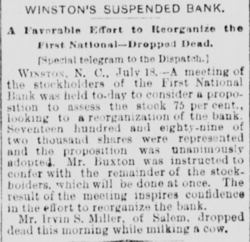 WINSTON'S SUSPENDED BANK. A Favorable Effort to Reorganize the First National-Dropped Dead. [Special telegram to the Dispatch.) WINSTON, N. C., July 18.-A meeting of the stockholders of the First National Bank was held to-day to consider a proposition to assess the stock 75 per cent., looking to a reorganization of the bank. Seventeen hundred and eighty-nine of two thousand shares were represented and the proposition was unanimously adopted. Mr. Buxton was instructed to confer with the remainder of the stockbolders, which will be done at once. The result of the meeting inspires confidence in the effort to reorganize the bank. Mr. Irvin S. Miller, of Salem, dropped dead this morning while milking a cow.