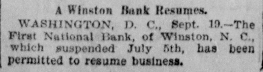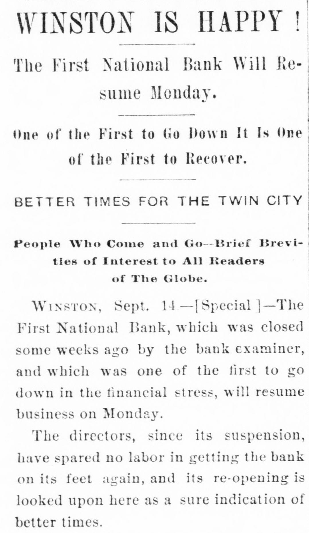 WINSTON IS HAPPY ! The First National Bank Will Resume Monday. One of the First to Go Down It Is One of the First to Recover. BETTER TIMES FOR THE TWIN CITY People Who Come and Go-Brief Brevities of Interest to All Readers of The Globe. WINSTON, Sept. 14-[Special - The First National Bank, which was closed some weeks ago by the bank examiner, and which was one of the first to go down in the financial stress, will resume business on Monday. The directors, since its suspension, have spared no labor in getting the bank on its feet again, and its re-opening is looked upon here as a sure indication of better times.