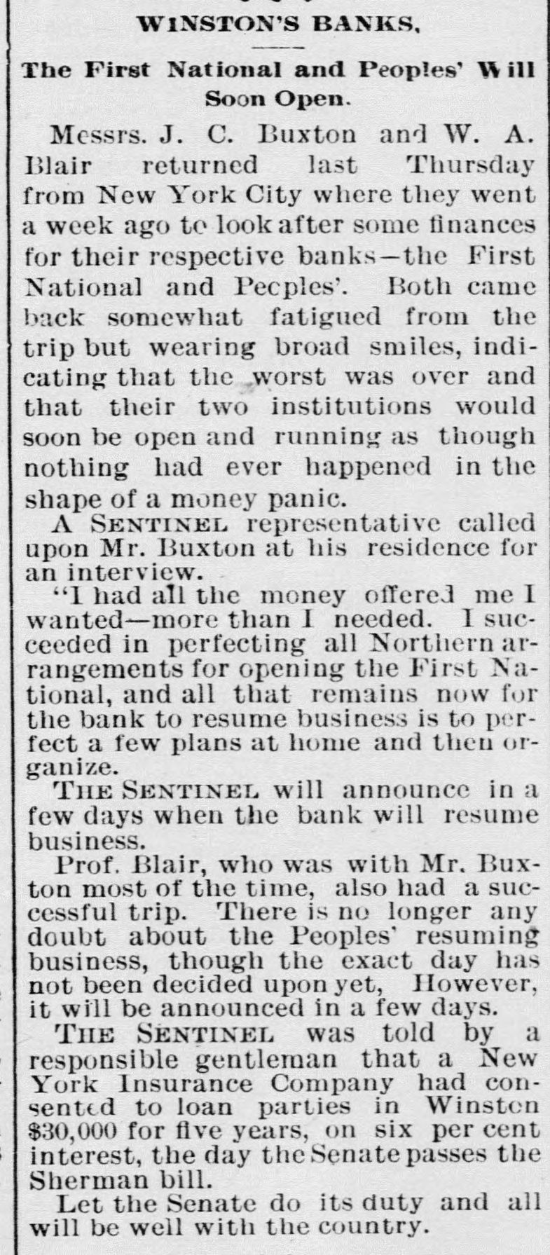 WINSTON'S BANKS, The First National and Peoples' Soon Open. Messrs. J. C. Buxton and W. A. Blair returned last Thursday from New York City where they went a week ago to look after some finances for their respective banks-the First National and Peoples'. Both came back somewhat fatigued from the trip but wearing broad smiles, indicating that the worst was over and that their two institutions would soon be open and running as though nothing had ever happened in the shape of a money panic. A SENTINEL representative called upon Mr. Buxton at his residence for an interview. "I had all the money offered me I wanted-more than I needed. I succeeded in perfecting all Northern arrangements for opening the First National, and all that remains now for the bank to resume business is to perfect a few plans at home and then organize. THE SENTINEL will announce in a few days when the bank will resume business. Prof. Blair, who was with Mr. Buxton most of the time, also had a successful trip. There is no longer any doubt about the Peoples' resuming business, though the exact day has not been decided upon yet, However, it will be announced in a few days. THE SENTINEL was told by a responsible gentleman that a New York Insurance Company had consented to loan parties in Winsten $30,000 for five years, on six per cent interest, the day the Senate passes the Sherman bill. Let the Senate do its duty and all will be well with the country.