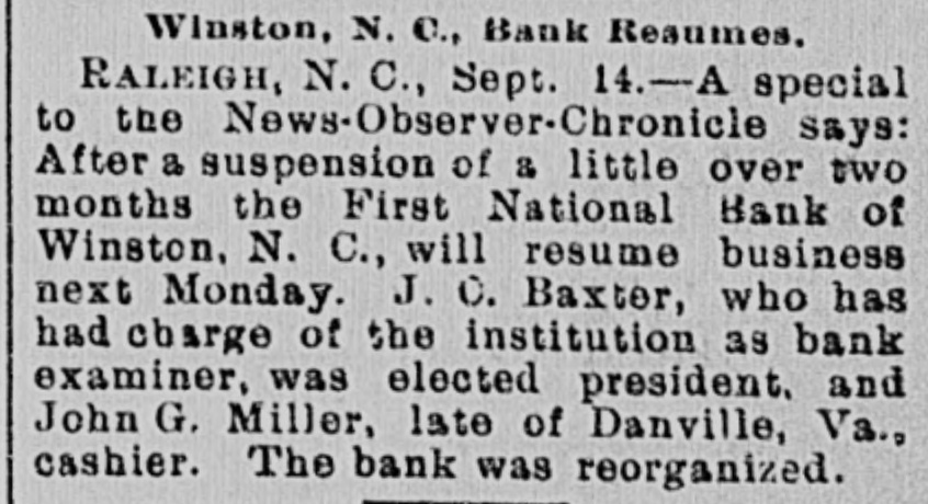 Winston, N. C., Bank Resumes. RALEIGH, N.C., Sept. 14.-A special to the News-Observer-Chronicle says: After a suspension of & little over two months the First National Bank of Winston, N. C., will resume business next Monday. J. O. Baxter, who has had charge of the institution as bank examiner, was elected president. and John G. Miller, late of Danville, Va., cashier. The bank was reorganized.