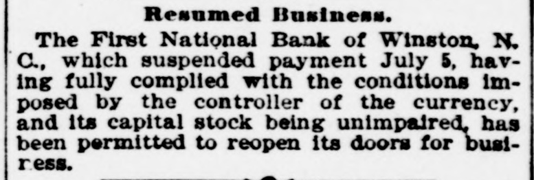 Resumed Business. The First National Bank of Winston, N. C., which suspended payment July 5, having fully complied with the conditions imposed by the controller of the currency, and its capital stock being unimpaired, has been permitted to reopen its doors for busiress.