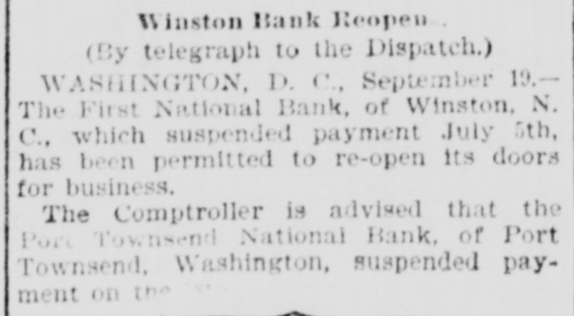 Winston Bank Reopens. (By telegraph to the Dispatch.) WASHINGTON, D.C., September 19.-The First National Bank, of Winston, N. C., which suspended payment July 5th, has been permitted to re-open its doors for business. The Comptroller is advised that the Port Townsend National Bank, of Port Townsend, Washington, suspended payment on the