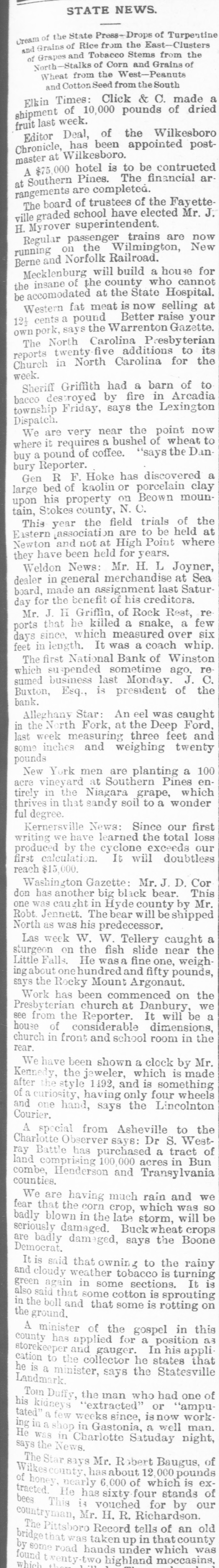 STATE NEWS. Cream of the State Press-Drops of Turpentine and Grains of Rice from the East-Clusters of Grapes and Tobacco Stems from the North-Stalks of Corn and Grains of Wheat from the West-Peanuts and CottonSeed from theSouth Elkin Times: Click & C. made a shipment of 10,000 pounds of dried fruit last week. Editor Deal, of the Wilkesboro Chronicle, has been appointed postmaster at Wilkesboro. A $75,000 hotel is to be contructed at Southern Pines. The financial ar rangements are completed. The board of trustees of the Fayetteville graded school have elected Mr. J. H. Myrover superintendent. Regular passenger trains are now running on the Wilmington, New Berne and Norfolk Railroad. Mecklenburg will build a hous for the insane of the county who cannot be accomodated at the State Hospital. Western fat meat is now selling at 121 cents a pound Better raise your own pork, says the Warrenton Gazette. The North Carolina Presbyterian reports twenty five additions to its Church in North Carolina for the week. Sheriff Griffith had a barn of to bacco destroyed by fire in Arcadia township Friday, says the Lexington Dispatch. We are very near the point now where it requires a bushel of wheat to buy a pound of coffee. "says the Dan bury Reporter. Gen R F. Hoke has discovered a large bed of kaolin or porcelain clay upon his property on Beown mountain, Stokes county, N. C. This year the field trials of the Eastern associati on are to be held at Newton and not at High Point where they have been held for years. Weldon News: Mr. H. L Joyner, dealer in general merchandise at Sea board, made an assignment last Saturday for the benefit of his creditors. Mr. J. H Griffin, of Rock Rest, re ports that he killed a snake, a few days since, which measured over six feet in length. It was a coach whip. The first National Bank of Winston which suspended sometime ago, re sumed business last Monday. J. C. Buxton, Esq., is president of the bank. Alleghany Star: An eel was caught in the North Fork, at the Deep Ford, last week measuring three feet and some inches and weighing twenty pounds New York men are planting a 100 acre vineyard at Southern Pines entirely in the Niagara grape, which thrives in that sandy soil to a wonder ful degree. Kernersville News: Since our first writing we have learned the total loss produced by the cyclone exceeds our first calculation. It will doubtless reach $15,000. Washington Gazette: Mr. J. D. Cor don has another big black bear. This one was caught in Hyde county by Mr. Robt Jennett. The bear will be shipped North as was his predecessor. Las week W. W. Tellery caught a sturgeon on the fish slide near the Little Falls. He wasa fine one, weighingabout one hundred and fifty pounds, says the Rocky Mount Argonaut. Work has been commenced on the Presbyterian church at Danbury, we see from the Reporter. It will be a house of considerable dimensions, church in front and school room in the rear. We have been shown a clock by Mr. Kennedy, the jeweler, which is made after the style 1492, and is something of a curiosity, having only four wheels and one hand, says the Lincolnton Courier. A special from Asheville to the Charlotte Observer says: Dr S. Westray Battle has purchased a tract of land comprising 100 000 acres in Bun combe, Henderson and Transylvania counties. We are having much rain and we fear that the corn crop, which was SO badly blown in the late storm, will be seriously damaged. Buck wheat crops are badly damaged, says the Boone Democrat. It is said that owning to the rainy and cloudy weather tobacco is turning green again in some sections. It is also said that some cotton is sprouting in the boll and that some is rotting on the ground. A minister of the gospel in this county has applied for a position as storekeeper and gauger. In his appli cation to the collector he states that he is a minister, says the Statesville Landmark. Tom Duffy, the man who had one of his kidneys "extracted" or "amputated" a few weeks since, is now working in a shop in Gastonia, a well man. He was in Charlotte Satuday night, says the News. The Star says Mr. R bert Baugus, of Wilkescounty hasabout 12 000 pounds of honey, nearly 6,000 of which is extracted. He has sixty four stands of bees This is vouched for by our countryman, Mr. H. R. Richardson. The Pittsboro Record tells of an old bridge that was taken up in that county by some road hands under which was found which twenty two highland moccasins,