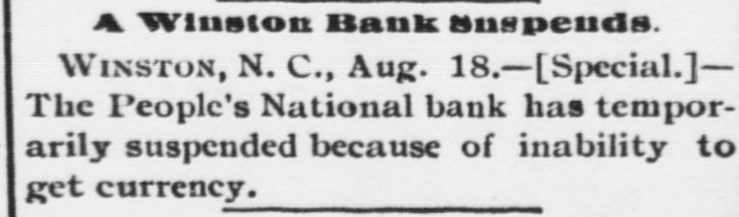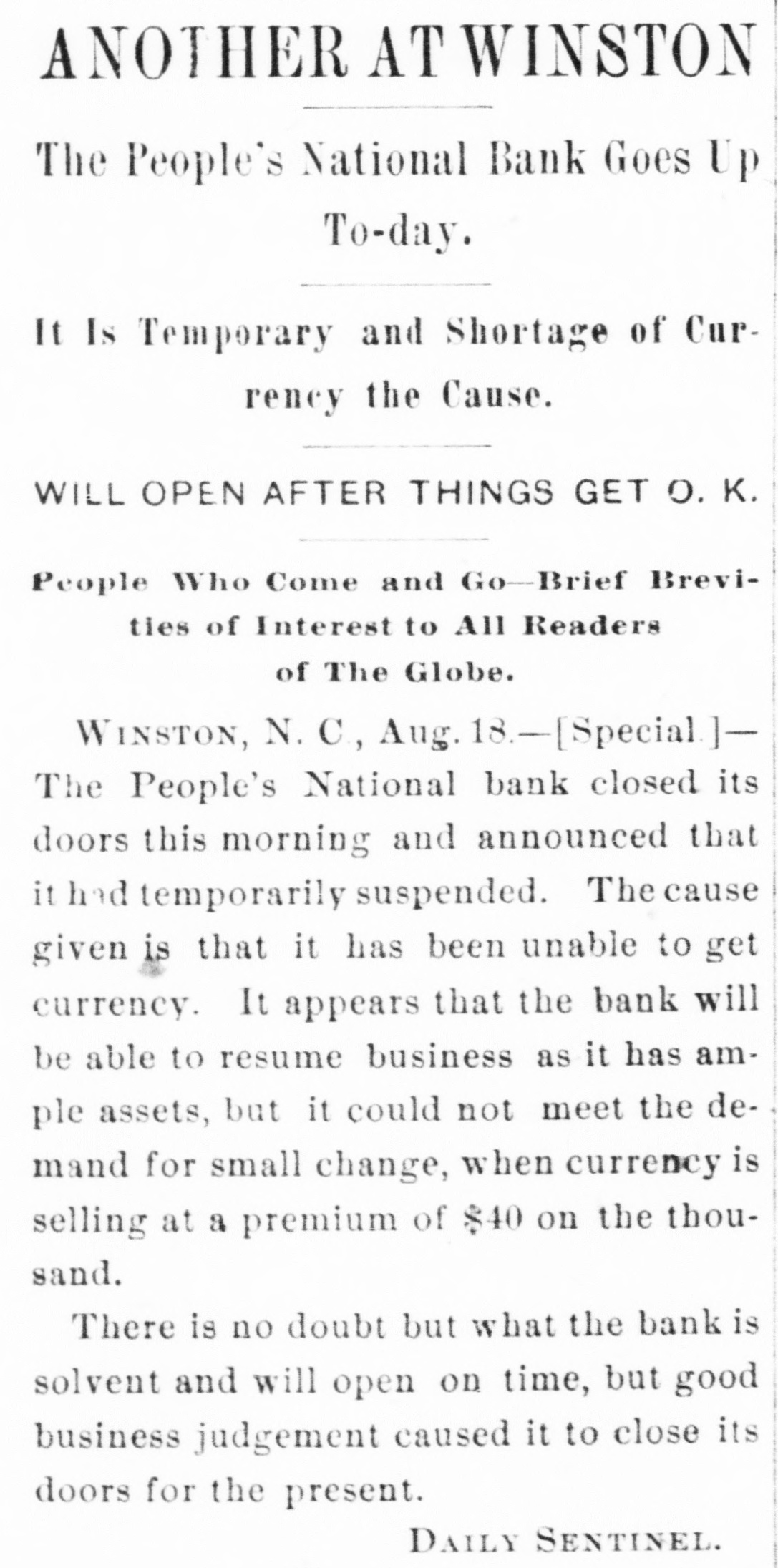 ANOTHER AT WINSTON The People's National Bank Goes Up To-day. It Is Temporary and Shortage of Currency the Cause. WILL OPEN AFTER THINGS GET O. K. People Who Come and Go-Brief Brevities of Interest to All Readers of The Globe. WINSTON, N. C, Aug. 18.-[Special.]The People's National bank closed its doors this morning and announced that it had temporarily suspended. The cause given is that it has been unable to get currency. It appears that the bank will be able to resume business as it has ample assets, but it could not meet the demand for small change, when currency is selling at a premium of $40 on the thousand. There is no doubt but what the bank is solvent and will open on time, but good business judgement caused it to close its doors for the present. DAILY SENTINEL.