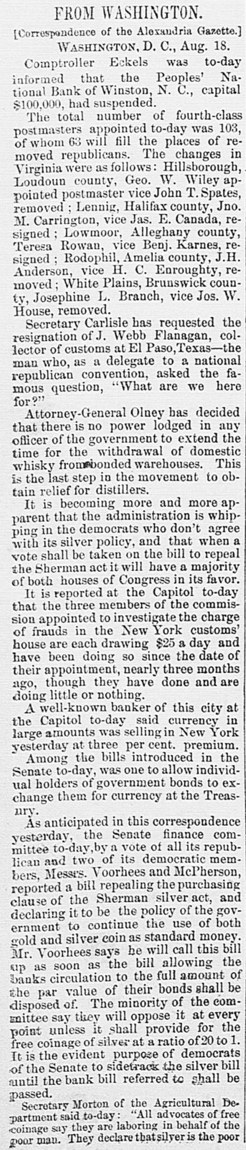 FROM WASHINGTON. [Correspendence of the Alexandria Gazette.] WASHINGTON, D. C., Aug. 18. Comptroller Eckels was to-day informed that the Peoples' National Bank of Winston, N. C., capital $100,000, had suspended. The total number of fourth-class postmasters appointed to-day was 103, of whom 63 will fill the places of removed republicans. The changes in Virginia were as follows: Hillsborough, Loudoun county, Geo. W. Wiley appointed postmaster vice John T. Spates, removed ; Lennig, Halifax county, Jno. M. Carrington, vice Jas. E. Canada, resigned Lowmoor, Alleghany county, Teresa Rowan, vice Benj. Karnes, resigned Rodophil, Amelia county, J.H. Anderson, vice H. C. Enroughty, removed; White Plains, Brunswick county, Josephine L. Branch, vice Jos. W. House, removed. Secretary Carlisle has requested the resignation of J. Webb Flanagan, collector of customs at El Texas-the man who, as a delegate to a national republican convention, asked the famous question, "What are we here for?" Attorney-General Olney has decided that there is no power lodged in any officer of the government to extend the time for the withdrawal of domestic whisky fromabonded warehouses. This is the last step in the movement to obtain relief for distillers. It is becoming more and more apparent that the administration is whipping in the democrats who don't agree with its silver policy, and that when a vote shall be taken on the bill to repeal the Sherman act it will have a majority of both houses of Congress in its favor. It is reported at the Capitol to-day that the three members of the commission appointed to investigate the charge of frauds in the New York customs' house are each drawing $25 a day and have been doing so since the date of their appointment, nearly three months ago, though they have done and are doing little or nothing. A well-known banker of this city at the Capitol to-day said currency in large amounts was selling in New York yesterday at three per cent. premium. Among the bills introduced in the Senate to-day, was one to allow individual holders of government bonds to exchange them for currency at the Treasmry. As anticipated in this correspondence yesterday, the Senate finance committee to-day, by a vote of all its republican and two of its democratic members, Messrs. Voorhees and McPherson, reported a bill repealing the purchasing clause of the Sherman silver act, and declaring it to be the policy of the government to continue the use of both gold and silver coin as standard money. Mr. Voorhees says he will call this bill up as soon as the bill allowing the banks circulation to the full amount of the par value of their bonds shall be disposed of. The minority of the committee say they will oppose it at every point unless it shall provide for the free coinage of silver at a ratio of 20 to 1. It is the evident purpose of democrats of the Senate to sidetrack the silver bill until the bank bill referred to shall be passed. Secretary Morton of the Agricultural Department said to-day "All advocates of free coinage say they are laboring in behalf of the poor man. They declare thatsilver is the poor