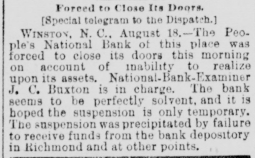 Forced to Close Its Doors. [Special telegram to the Dispatch.] WINSTON, N. C., August 18.-The People's National Bank of this place was forced to close its doors this morning on account of inability to realize upon its assets. National-Bank-Examiner J. C. Buxton is in charge. The bank seems to be perfectly solvent, and it is hoped the suspension is only temporary. The suspension was precipitated by failure to receive funds from the bank depository in Richmond and at other points.