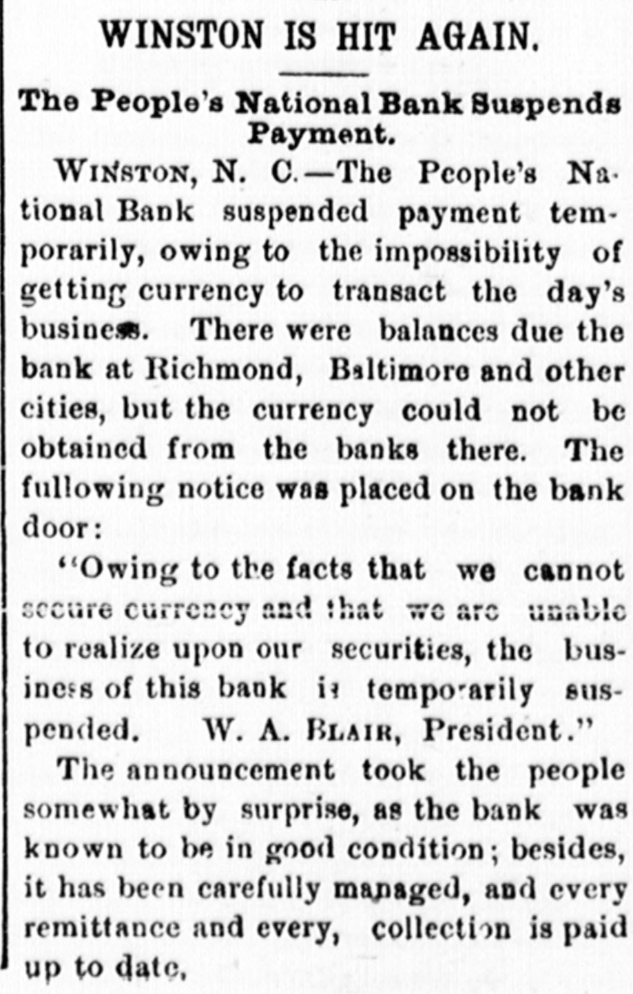 WINSTON IS HIT AGAIN. The People's National Bank Suspends Payment. WINSTON, N. C.-The People's Na. tional Bank suspended payment temporarily, owing to the impossibility of getting currency to transact the day's business. There were balances due the bank at Richmond, Baltimore and other cities, but the currency could not be obtained from the banks there. The fullowing notice was placed on the bank door: "Owing to the facts that we cannot secure currency and that we are unable to realize upon our securities, the business of this bank is temporarily susW. A. BLAIR, President." pended. The announcement took the people somewhat by surprise, as the bank was known to be in good condition; besides, it has been carefully managed, and every remittance and every, collection is paid up to date,