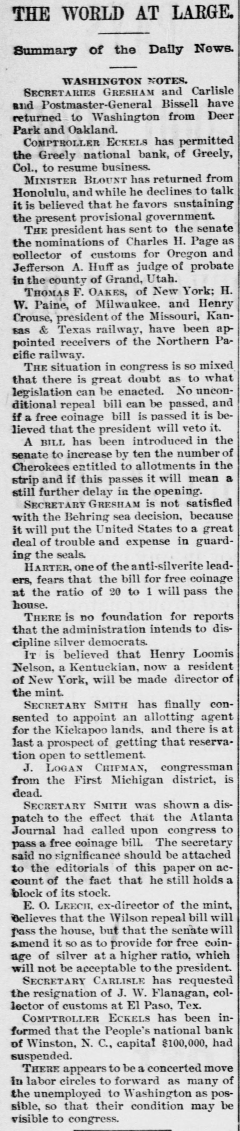 THE WORLD AT LARGE. Summary of the Daily News. WASHINGTON NOTES. SECRETARIES GRESHAM and Carlisle and Postmaster-General Bissell have returned to Washington from Deer Park and Oakland. COMPTROLLER ECKELS has permitted the Greely national bank, of Greely, Col., to resume business. MINISTER BLOUNT has returned from Honolulu, and while he declines to talk it is believed that he favors sustaining the present provisional government. THE president has sent to the senate the nominations of Charles H. Page as collector of customs for Oregon and Jefferson A. Huff as judge of probate in the county of Grand, Utah. THOMAS F. Oakes, of New York; H. W. Paine, of Milwaukee. and Henry Crouse, president of the Missouri, Kansas & Texas railway, have been appointed receivers of the Northern Pacific railway. THE situation in congress is so mixed that there is great doubt as to what legislation can be enacted. No unconditional repeal bill can be passed, and if a free coinage bill is passed it is believed that the president will veto it. A BILL has been introduced in the senate to increase by ten the number of Cherokees entitled to allotments in the strip and if this passes it will mean a still further delay in the opening. SECRETARY GRESHAM is not satisfied with the Behring sea decision, because it will put the United States to a great deal of trouble and expense in guarding the seals. HARTER, one of the anti-silverite leaders, fears that the bill for free coinage at the ratio of 20 to 1 will pass the house. THERE is no foundation for reports that the administration intends to discipline silver democrats. IT is believed that Henry Loomis Nelson, a Kentuckian, now a resident of New York, will be made director of the mint. SECRETARY SMITH has finally consented to appoint an allotting agent for the Kickapoo lands, and there is at last a prospect of getting that reservation open to settlement. J. LOGAN CHIPMAN, congressman from the First Michigan district, is dead. SECRETARY SMITH was shown a dispatch to the effect that the Atlanta Journal had called upon congress to pass a free coinage bill. The secretary said no significance should be attached to the editorials of this paper on account of the fact that he still holds a block of its stock. E. O. LEECH, ex-director of the mint, Delieves that the Wilson repeal bill will pass the house, but that the senate will amend it so as to provide for free coinage of silver at a higher ratio, which will not be acceptable to the president. SECRETARY CARLISLE has requested the resignation of J. W. Flanagan, colloctor of customs at El Paso, Tex. COMPTROLLER ECKELS has been informed that the People's national bank of Winston, N. C., capital $100,000, had suspended. THERE appears to be a concerted move in labor circles to forward as many of the unemployed to Washington as possible, so that their condition may be visible to congress.
