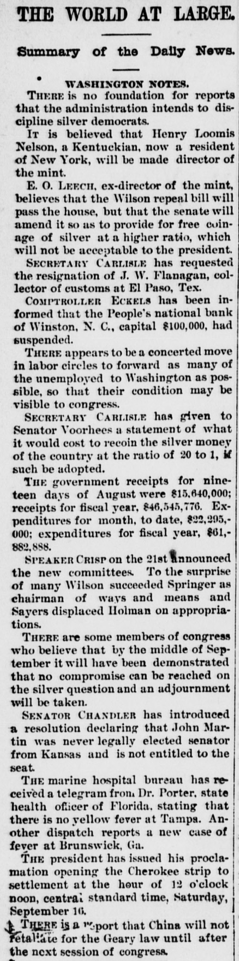 THE WORLD AT LARGE. Summary of the Daily News. WASHINGTON NOTES. THERE is no foundation for reports that the administration intends to discipline silver democrats. IT is believed that Henry Loomis Nelson, a Kentuckian, now a resident of New York, will be made director of the mint. E. O. LEECH. ex-director of the mint, believes that the Wilson repeal bill will pass the house, but that the senate will amend it so as to provide for free coinage of silver at a higher ratio, which will not be acceptable to the president. SECRETARY CARLISLE has requested the resignation of J. W. Flanagan, collector of customs at El Paso, Tex. COMPTROLLER ECKELS has been informed that the People's national bank of Winston, N. C., capital $100,000, had suspended. THERE appears to be a concerted move in labor circles to forward as many of the unemployed to Washington as possible, so that their condition may be visible to congress. SECRETARY CARLISLE has given to Senator Voorhees a statement of what it would cost to recoin the silver money of the country at the ratio of 20 to 1, if such be adopted. THE government receipts for nineteen days of August were $15,640,000; receipts for fiscal year, $46,545,776. Expenditures for month, to date, $22,295,000; expenditures for fiscal year, $61,882,888. SPEAKER CRISP on the 21st announced the new committees. To the surprise of many Wilson succeeded Springer as chairman of ways and means and Sayers displaced Holman on appropriations. THERE are some members of congress who believe that by the middle of September it will have been demonstrated that no compromise can be reached on the silver question and an adjournment will be taken. SENATOR CHANDLER has introduced a resolution declaring that John Martin was never legally elected senator from Kansas and is not entitled to the seat. THE marine hospital bureau has received a telegram from Dr. Porter. state health officer of Florida. stating that there is no yellow fever at Tampa. Another dispatch reports a new case of fever at Brunswick, Ga. THE president has issued his proclamation opening the Cherokee strip to settlement at the hour of 12 o'clock noon, central standard time, Saturday, September 16. THERE is a "sport that China will not retal:ate for the Geary law until after the next session of congress.